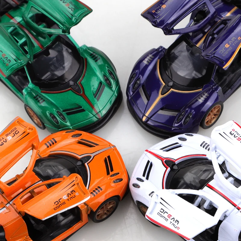 This diecast alloy pull-back racing car is crafted from metal and features a sleek 1:36 scale design with stylish triple doors. Available in vibrant orange, white, green, and purple, the car boasts a glossy, aerodynamic body with low-profile, curved silhouettes, accented by bold contrasting details. Large rear wings, either integrated or attachable, add a sporty look, while clear windshields reveal simplified interiors. The metallic bronze or copper-toned wheels enhance its dynamic appearance. Suitable for ages 4 and older, this collectible item is perfect for racing enthusiasts and collectors alike, offering high-quality craftsmanship and eye-catching vivid colors for an engaging play or display experience.