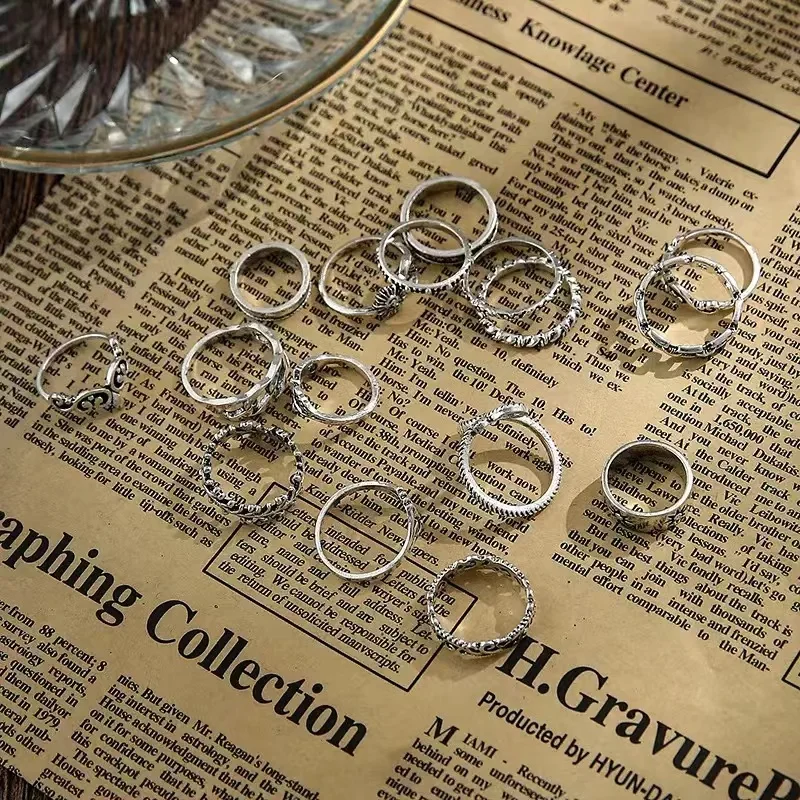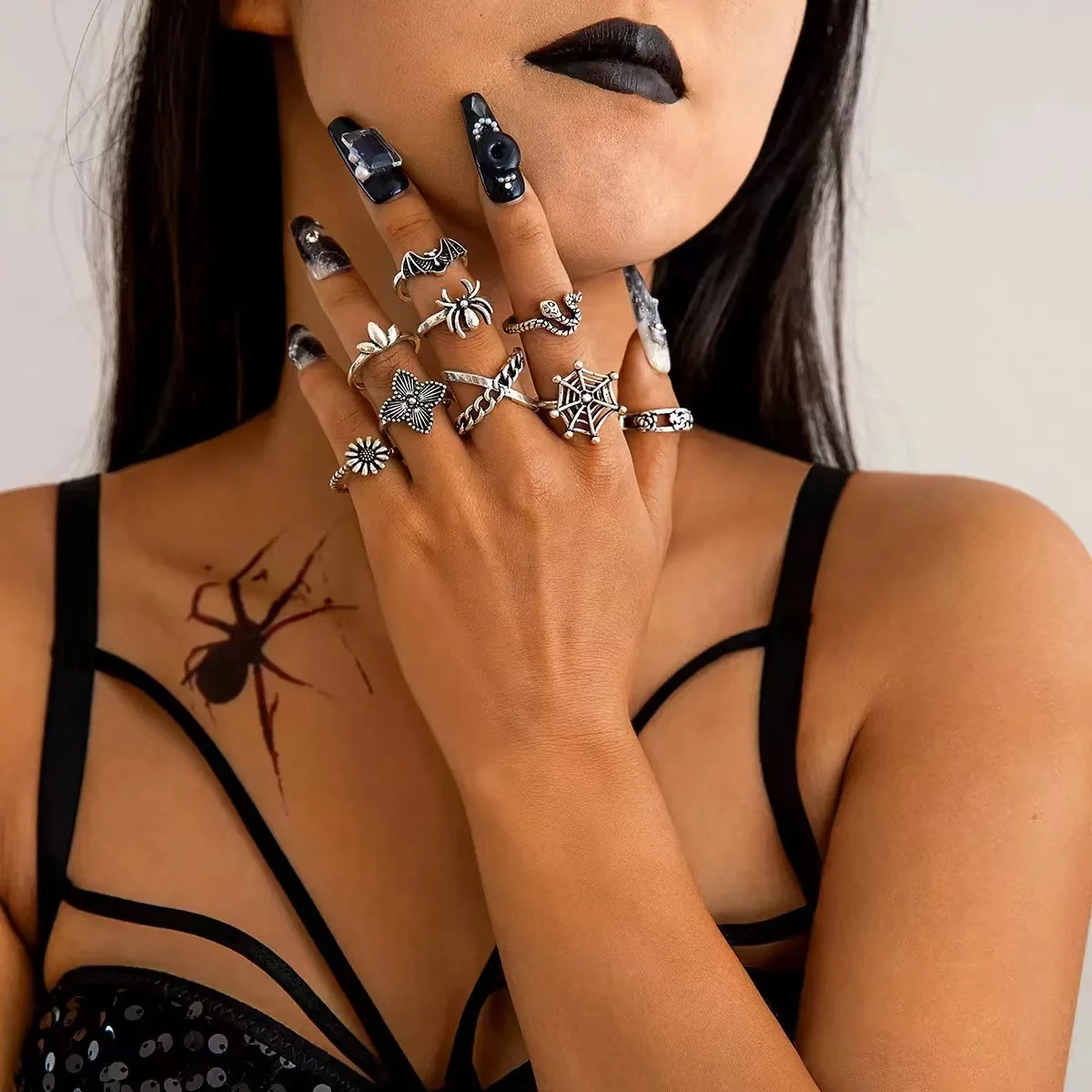 Punk-Inspired 16-Piece Ring Set with Motifs
