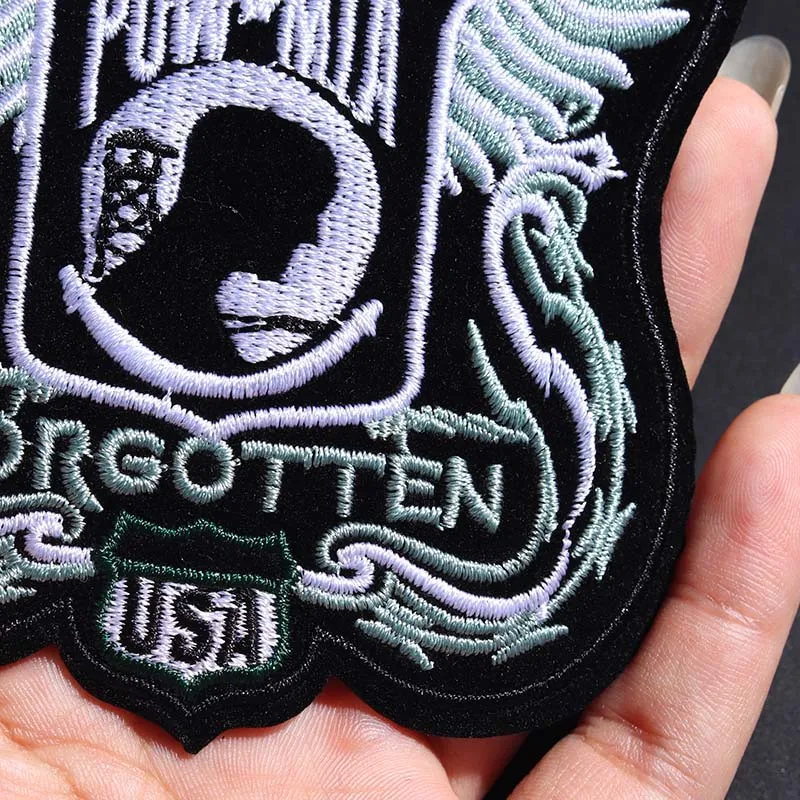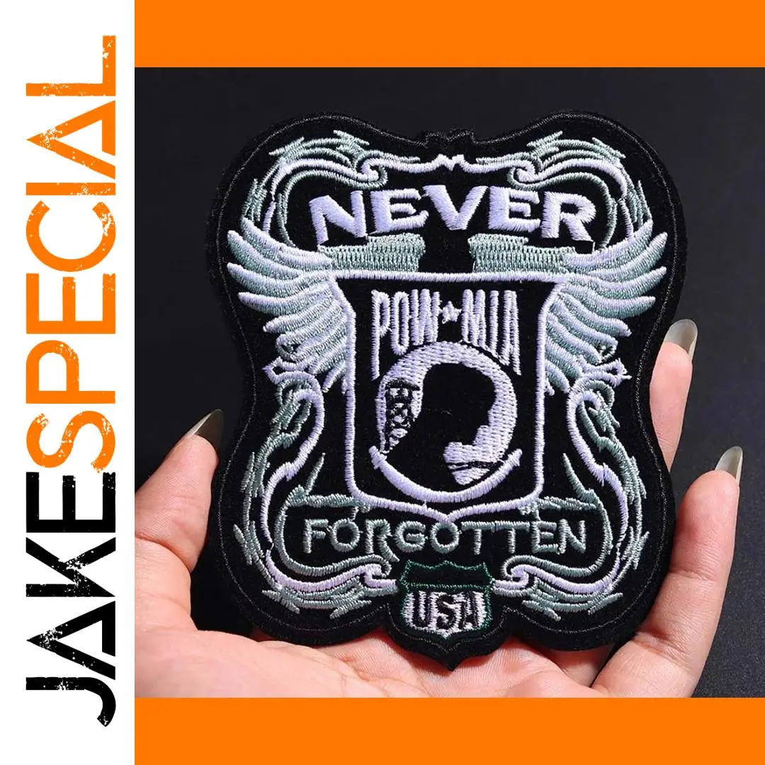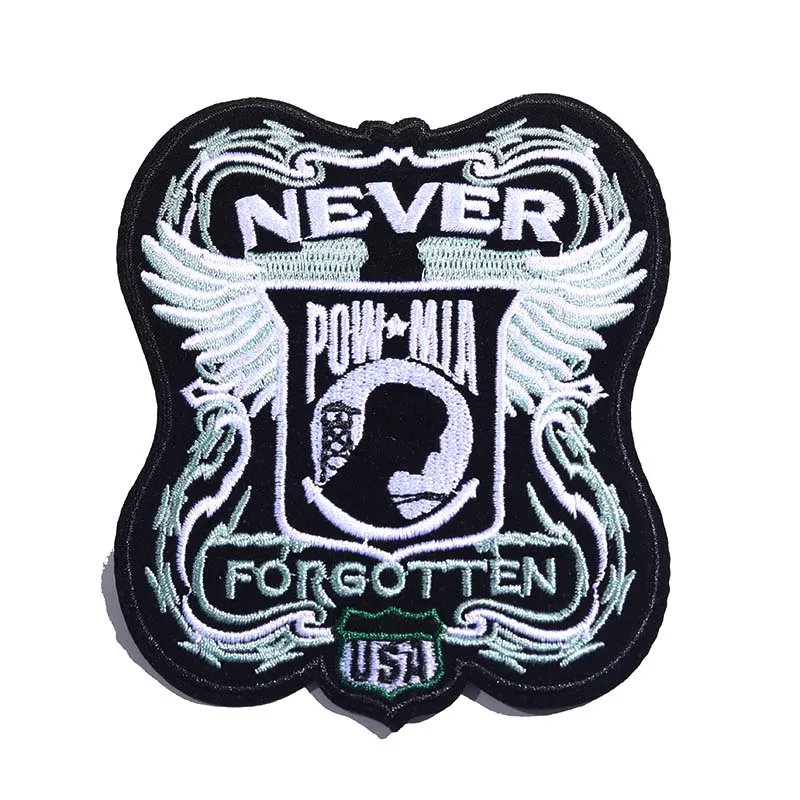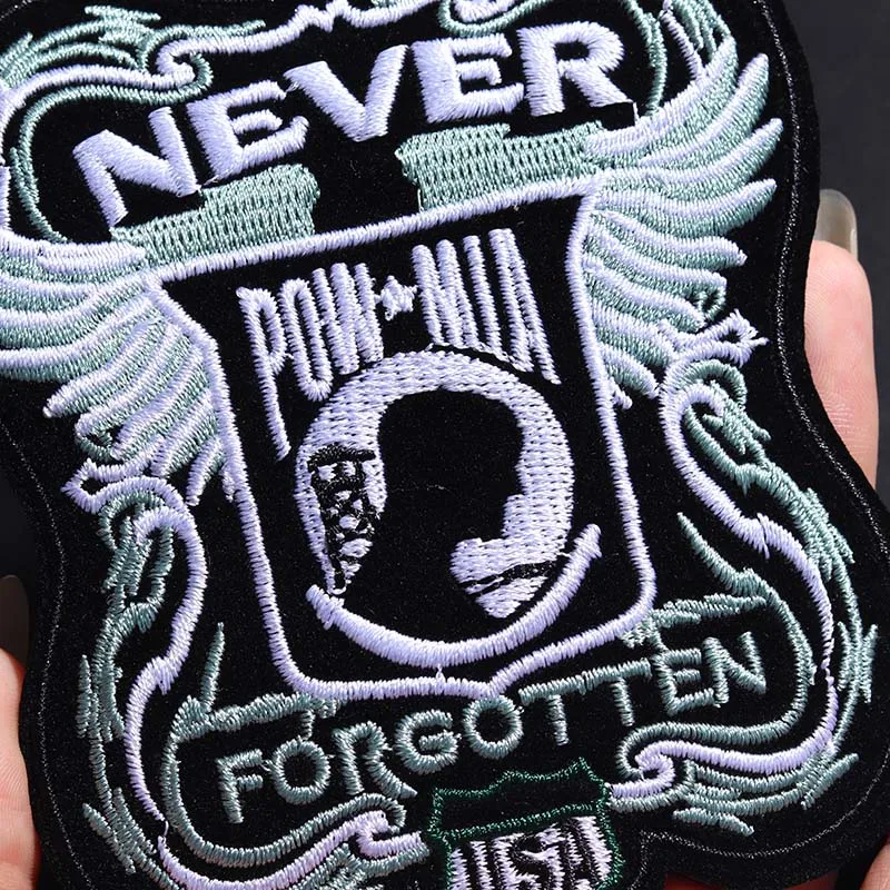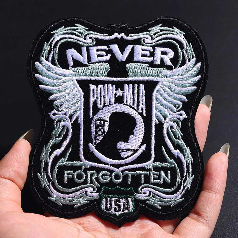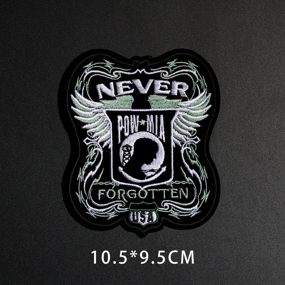 Elevate your wardrobe with this striking embroidered patch. Measuring 10.5 x 9.5 cm, it features a bold design that showcases the word “NEVER” in white uppercase letters, complemented by the acronym “POW-MIA” against a vivid black background. A silhouette of a soldier's head is adorned with dynamic light blue and gray wings, lending an ethereal yet powerful aesthetic. The bottom text reads “FORGOTTEN,” with “USA” stitched in vibrant green, all bordered in black. Crafted from durable non-woven fabric, this patch can be easily ironed or sewn onto your favorite clothing items, making it a perfect accessory for bikers and enthusiasts alike.