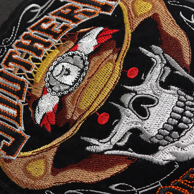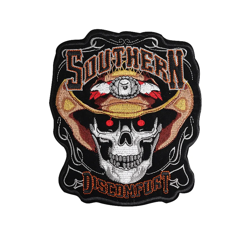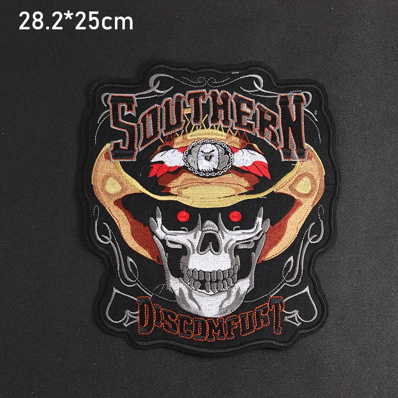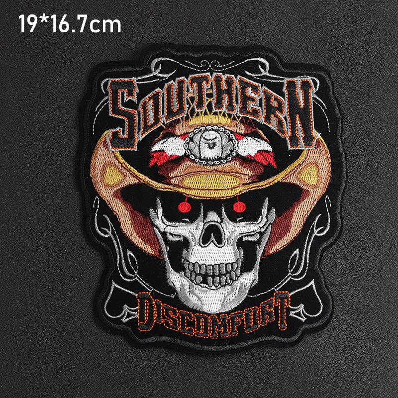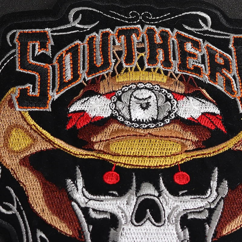 This punk-style skull cloth patch is a bold fashion statement, perfect for any creative wardrobe. With a striking gray skull graphic intricately embroidered, it showcases a remarkable 3D effect. Vibrant red accents provide contrast against the black background, while ornamental details, including a decorative silver and yellow emblem, enhance its charm. The bold “SOUTHERN” text in orange catches the eye, making it an appealing piece for enthusiasts of edgy design. Handmade from eco-friendly non-woven fabric, this patch is easy to apply using a household iron or heat press machine, allowing you to personalize T-shirts, jackets, bags, and more. Stand out effortlessly with this unique accessory.