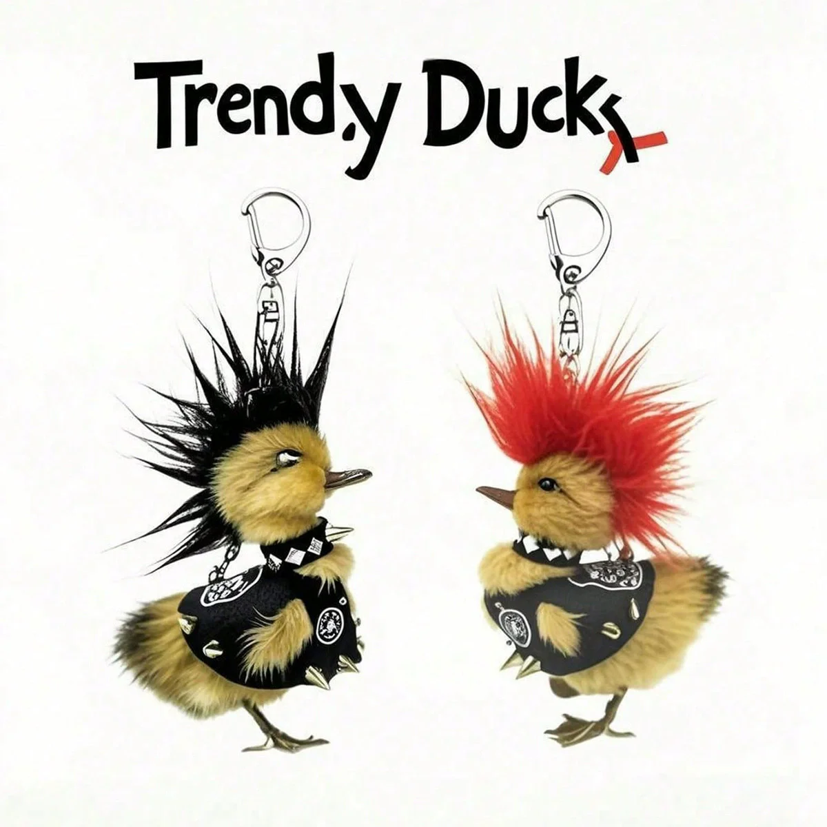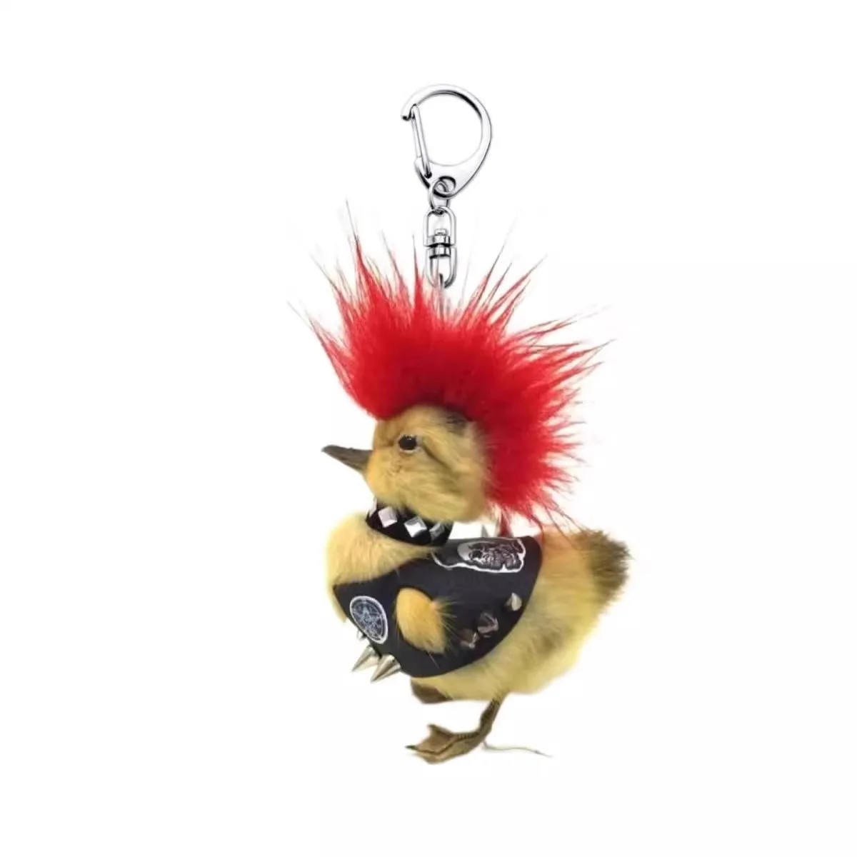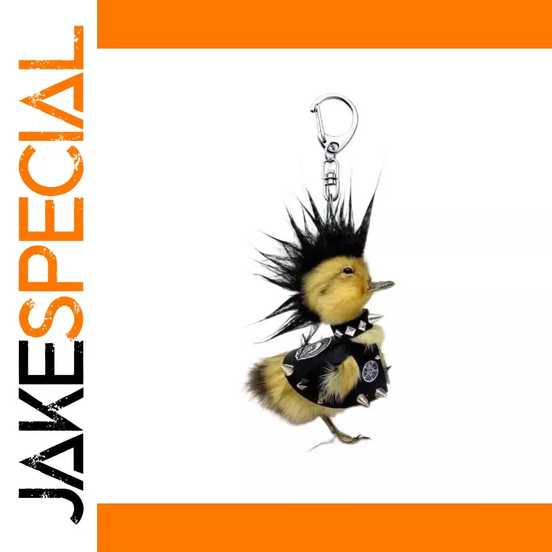 - This distinctive keychain features a plush, faux fur duck dressed in black with metallic silver studs, blending adorable animal charm with bold punk rock style. Perfect for expressive fashion enthusiasts.