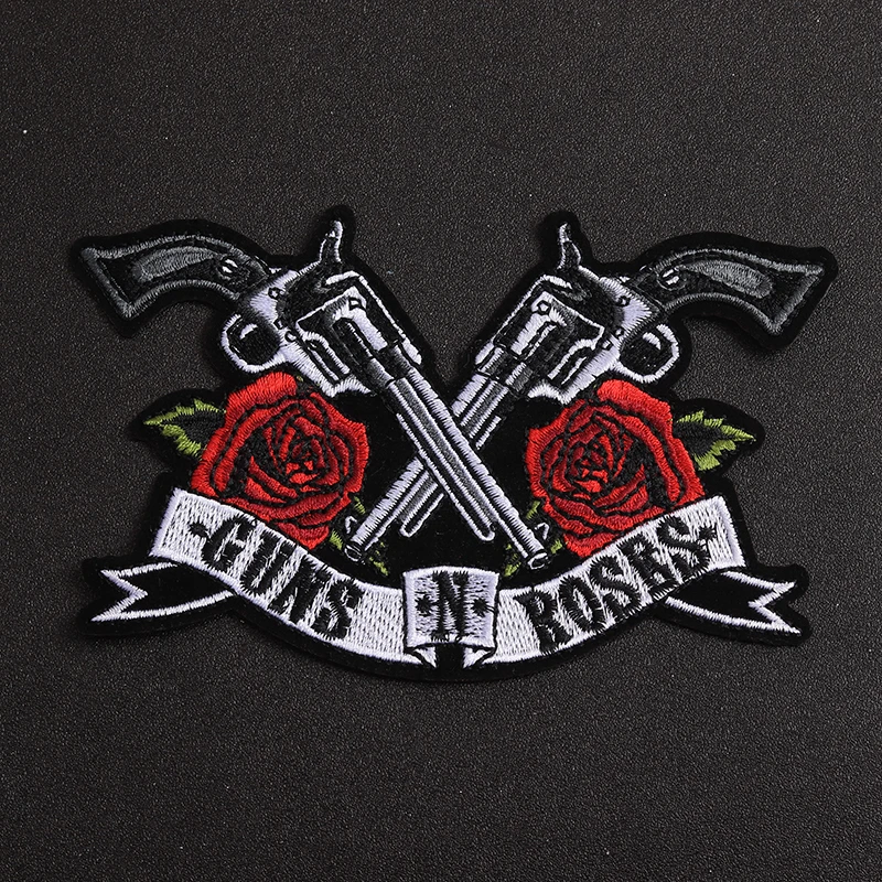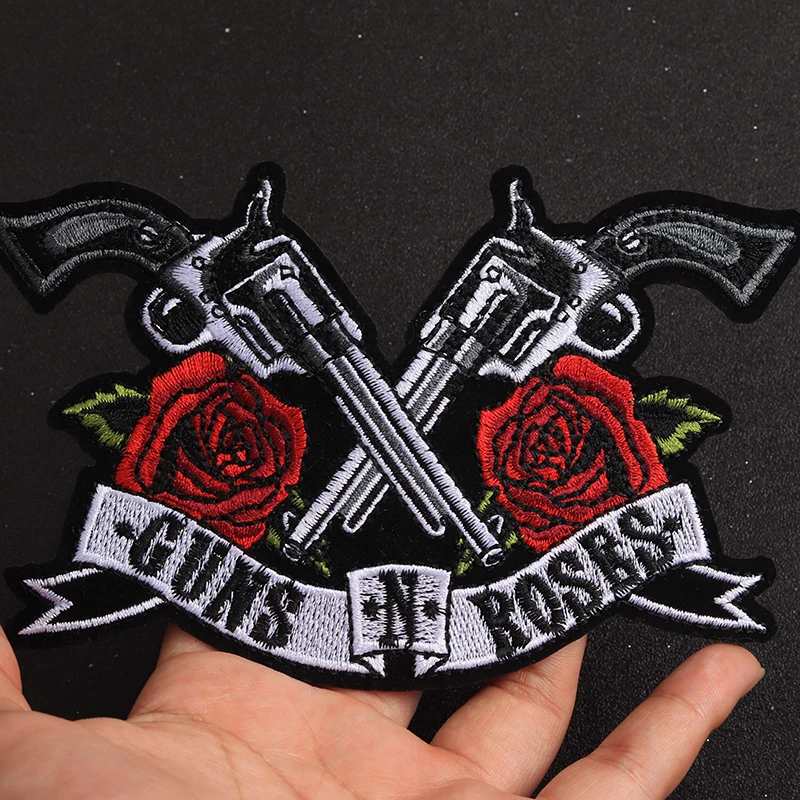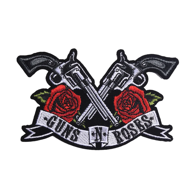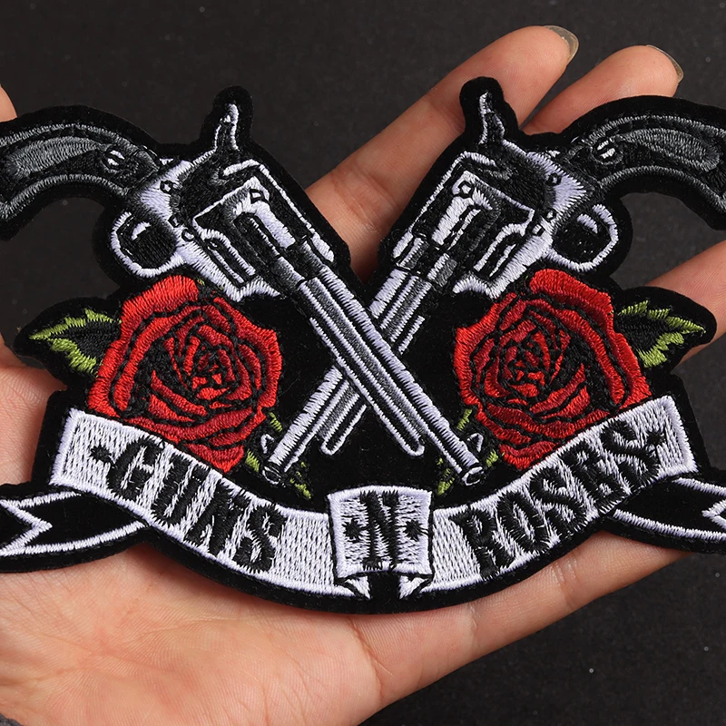 Transform your wardrobe with these stunning punk-style rose patches, each measuring 14.5 x 9.1 cm. This set includes 5 pieces crafted from eco-friendly non-woven fabric, featuring a vibrant design of crossed revolver guns and red roses, complete with green leaves. The patches showcase a unique 3D, handmade quality and are perfect for DIY embroidery applications. Easily apply them to your favorite clothing or accessories using a household iron or heat press machine. Ideal for t-shirts, tops, pants, coats, bags, and curtains, these iron-on patches add a bold statement to any outfit.