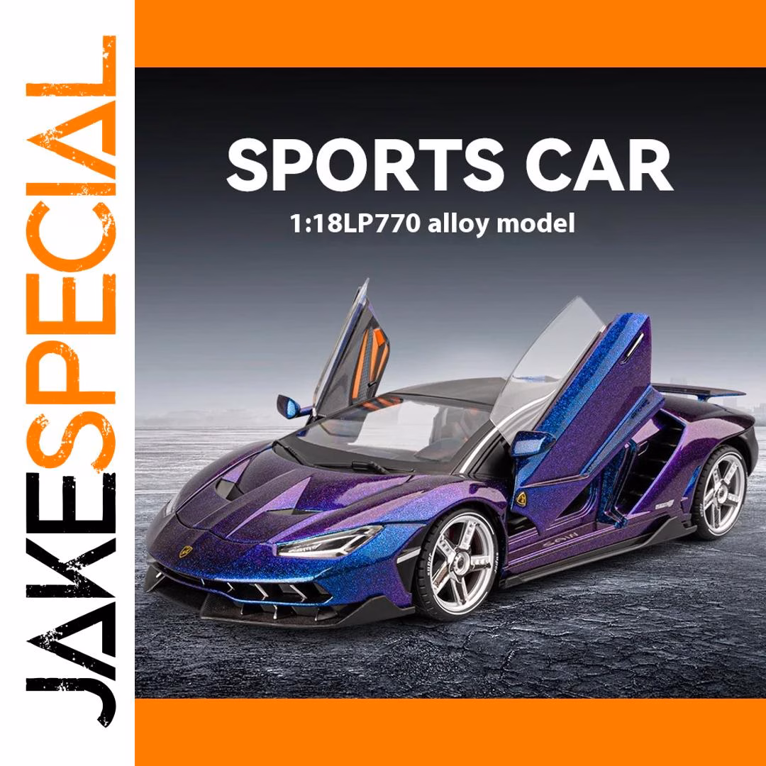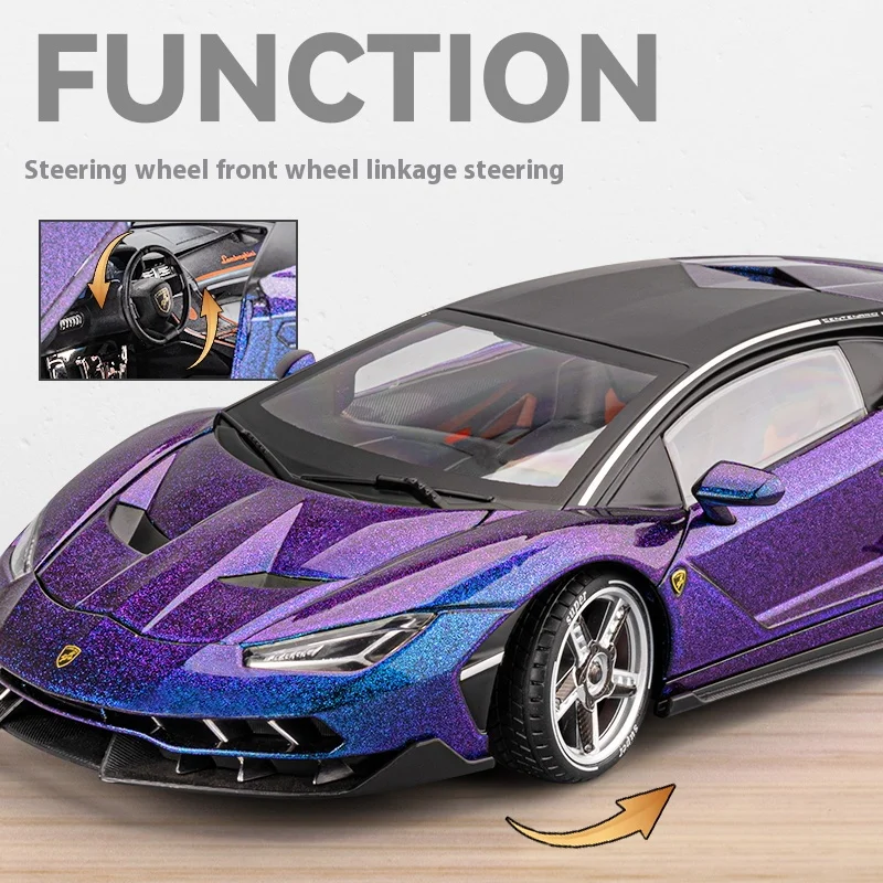 Experience the thrill of owning this highly detailed 1:18 scale diecast vehicle. Finished in a vibrant purple with a glittery, sparkly surface, this model captures the sleek, aerodynamic lines of a modern sports car. Its aggressive styling features sharp angles, muscular body contours, and small, aerodynamic side mirrors, making it an eye-catching display piece. The front sports a wide black grille with silver accents and sharply angled LED-like headlights, adding to its sporty appeal. Open the vertically swinging doors to reveal a detailed interior with seats, dashboard, and steering wheel, enhancing realism. Perfect for collectors or enthusiasts, this model combines visual impact with functional LED lights and sound effects, creating an immersive showcase experience. An excellent addition to any indoor collection.