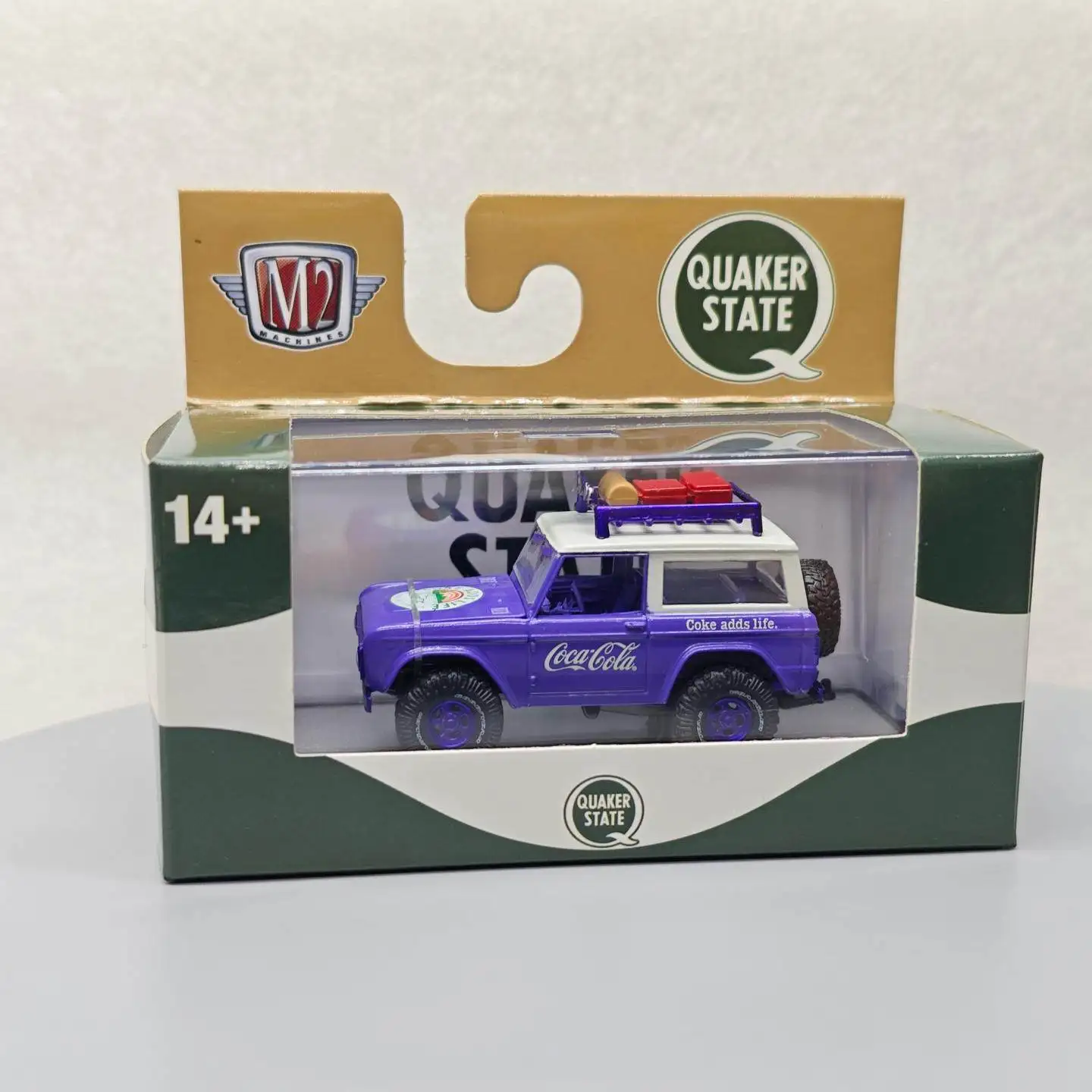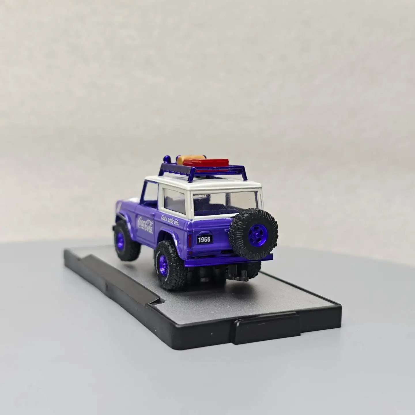 Bring home this highly detailed 1:64 scale diecast model of a 1966 Bronco, crafted from durable alloy metal. Featuring a vibrant purple exterior, black wheels with matching purple rims, clear windows revealing a dark interior, and detailed accents such as a blue roof rack with yellow lights and a red spare tire, this miniature replica captivates with its realistic design. Perfect for collectors and enthusiasts aged 14 and above, it sits elegantly on a black display base, making it an ideal decorative piece or gift. Crafted without electrical components or batteries, this model emphasizes craftsmanship and authenticity, adding a touch of vintage charm to any collection.