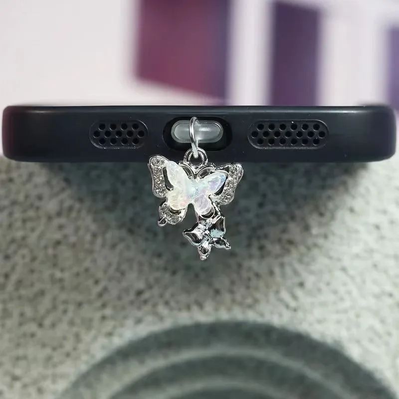 Imagine adding a charming touch to your phone with this delicate hanging ornament. Crafted from PVC, this decorative dust plug fits seamlessly into your Apple iPhone Lightning port or Type-C interface, measuring 1.7 cm wide and 3.1 cm long. Its vibrant purple color instantly draws attention and complements your device elegantly. The ornament features a stunning silver-toned butterfly charm adorned with iridescent, holographic stones that shimmer in multiple hues, creating a captivating sparkling effect. Below, a sleek gold-tone butterfly adds a touch of sophistication. Designed to dangle freely, this accessory combines style and practicality while protecting your port from dust and dirt. A subtle way to express your personality daily.