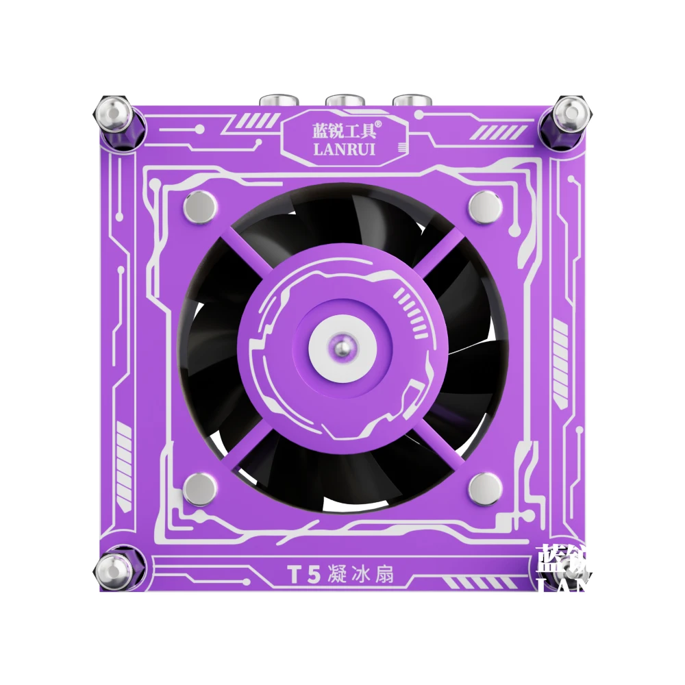 Experience the ultimate in mobile phone repair technology with this compact, sleek Lanrui T5 Ice Condensing Fan. Measuring just 56x56x25mm and weighing only 100g, it is designed to seamlessly integrate into your workflow. The vibrant purple color, combined with smooth surface details and circuit-like engravings, offers a modern, high-tech aesthetic. Equipped with a built-in 900mAh battery and supporting PD fast charging via Type-C (5V), this device ensures reliable power during extensive repair sessions. Its multifunctional design includes a powerful 3W UV curing lamp and rapid heat dissipation, cooling components in as little as 3 seconds at 1W. The device features three adjustable airflow speeds, independently controlled with LED indicators showing wind levels—green, blue, and red—to match your specific repair needs. With smoke exhaust capability and one-click shutdown, it simplifies complex tasks while maintaining a sleek, professional look. Perfect for technicians and DIY enthusiasts seeking efficiency and style in their tools, this fan elevates your repair game to new levels of precision and reliability.