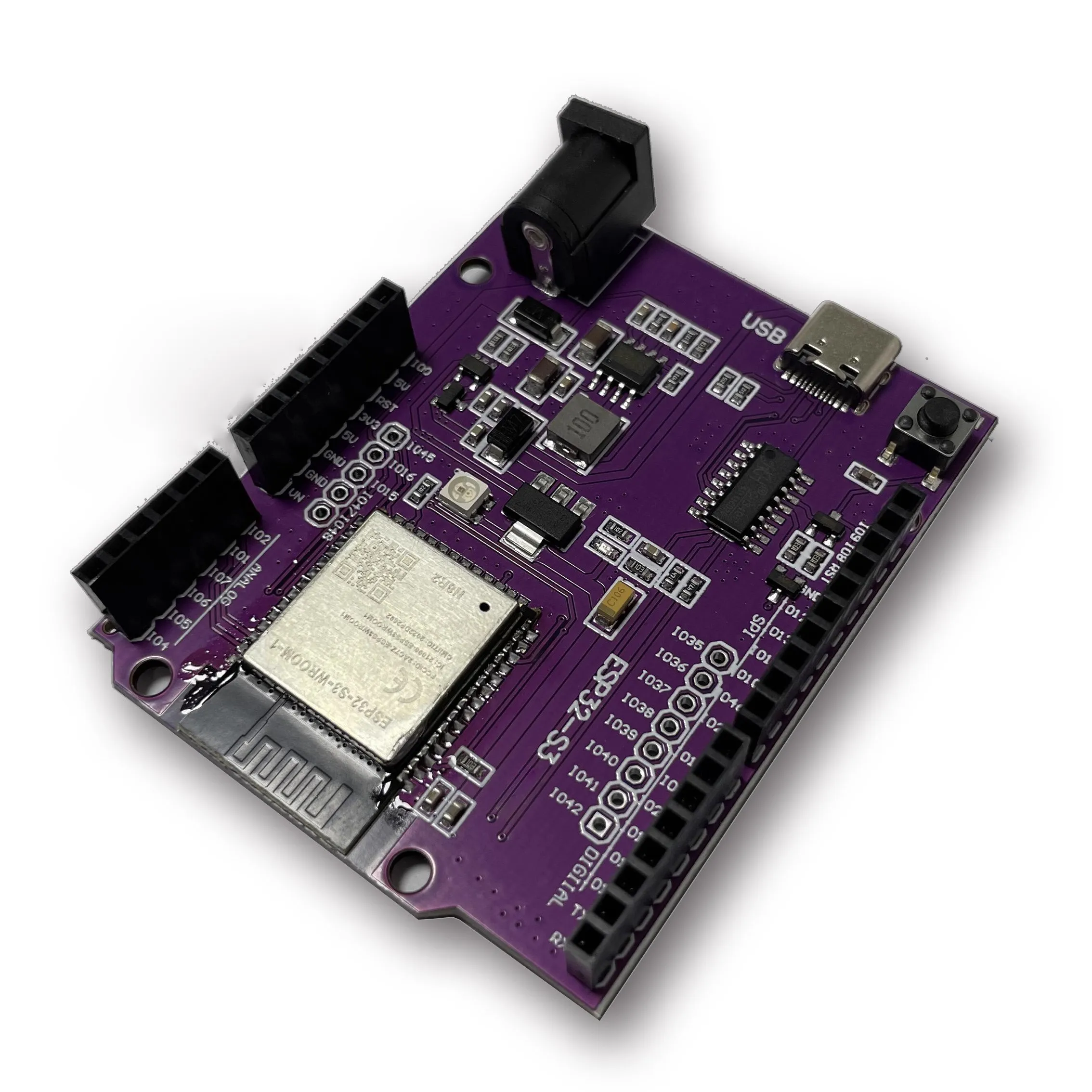 Experience cutting-edge connectivity with this stunning purple ESP32-S3 development board, designed for innovative projects. Its sleek, modern aesthetic showcases a vibrant purple PCB base, accented by reflective silver microcontroller modules that highlight the core technology. The board features an onboard PCB antenna with intricate copper trace patterns, adding a subtle metallic shimmer. Sharp black pin headers and connectors offer a striking contrast, complementing the overall high-tech look. With its layered, slightly angled layout, this development board exudes a dynamic and sophisticated appearance, inspiring confidence in its performance. Perfect for developers seeking a reliable, visually appealing platform for IoT, AI, and smart device applications, this board combines style with top-tier technical capabilities to help bring your ideas to life.