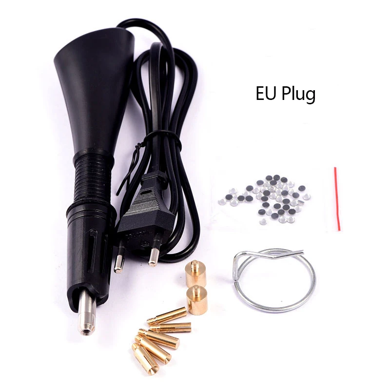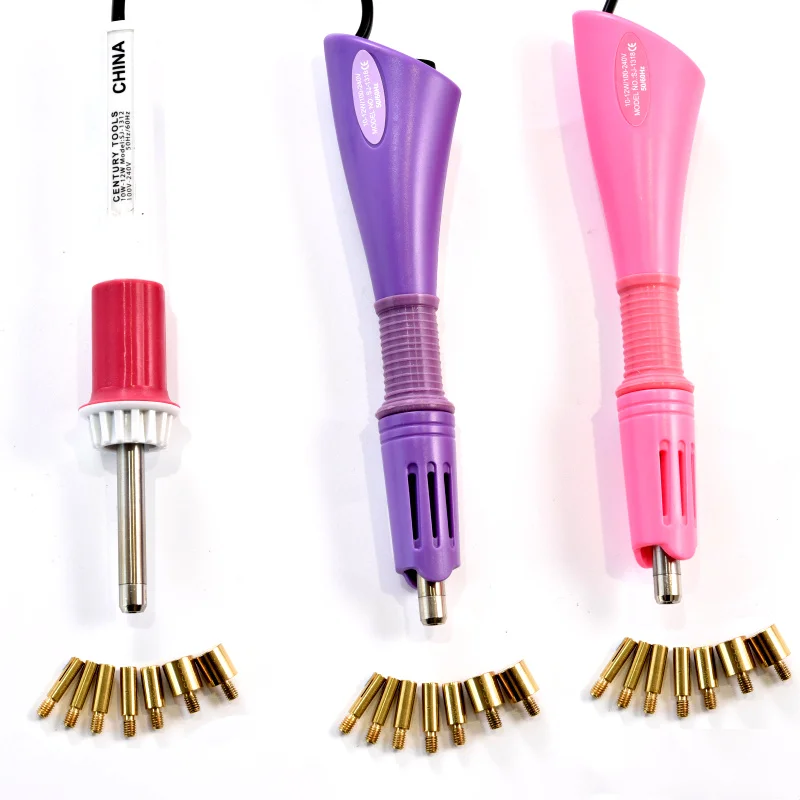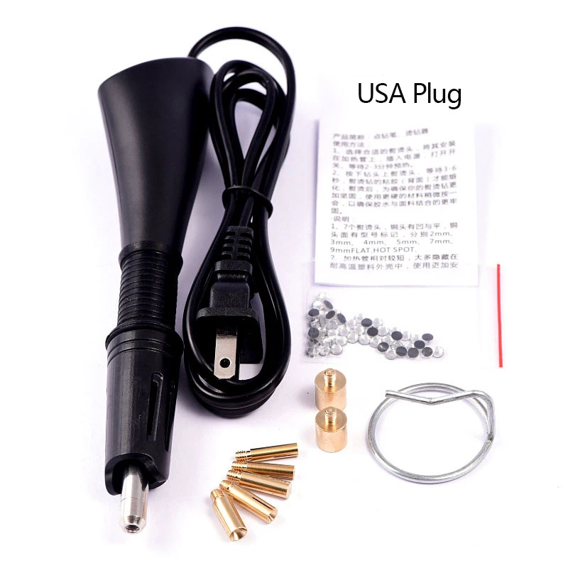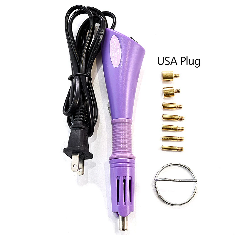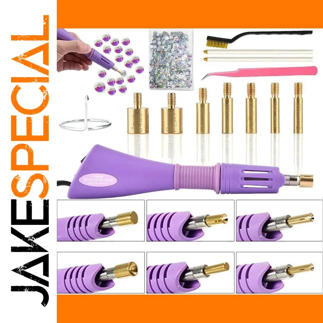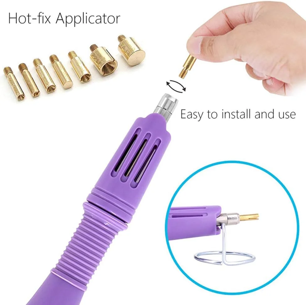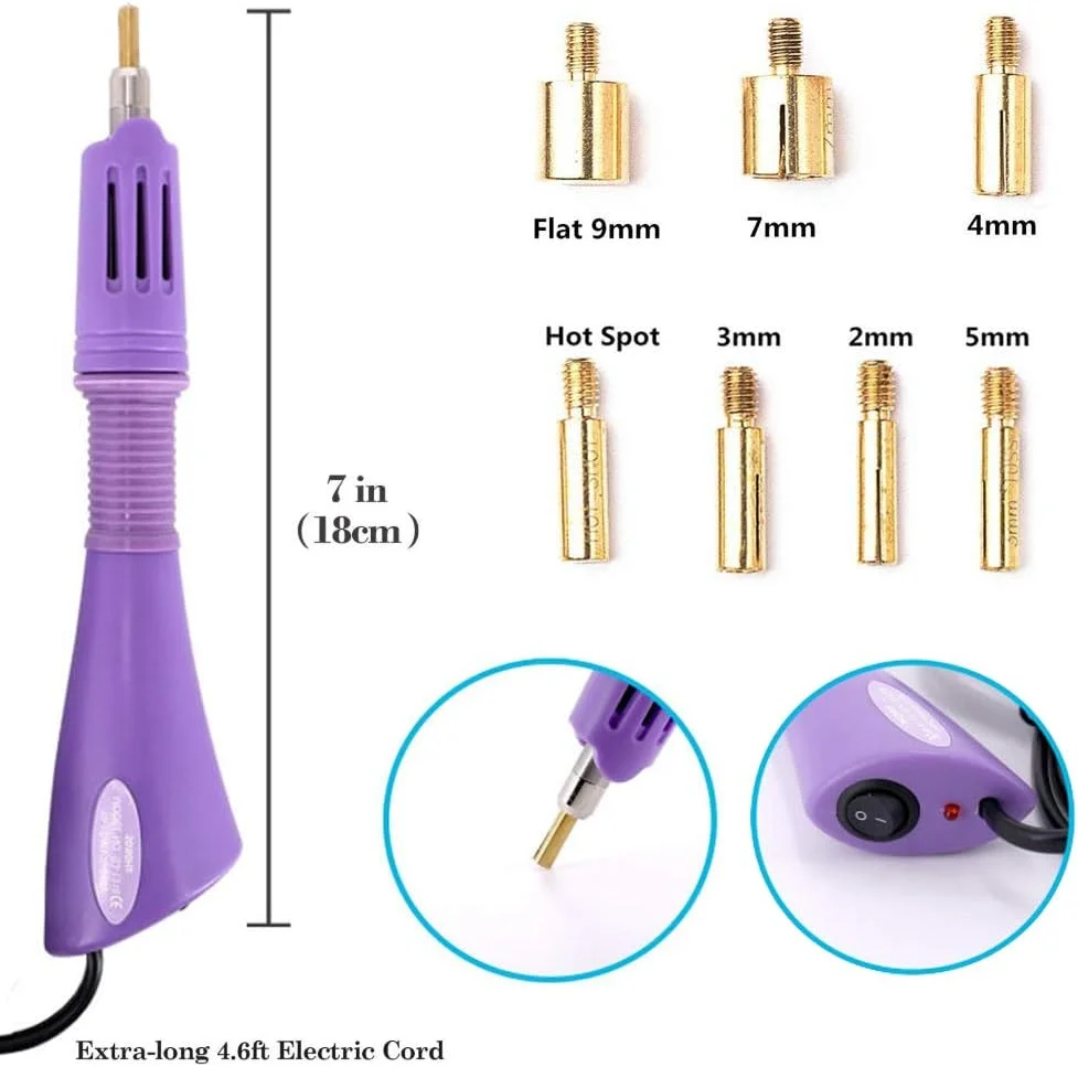 Experience precise rhinestone application with this versatile hotfix applicator kit featuring a sleek purple plastic body, textured grip, and seven interchangeable tips ranging from SS6 (2mm) to SS34 (7mm), including special 4mm hot spot and 9mm flat options. Operates at 110V to 240V with a 120cm cord and heats up in just 2-3 minutes for quick, efficient use. The metallic gold tips add a touch of elegance, while the comprehensive set includes tools for cleaning and precision placement, making it ideal for adding dazzling embellishments to clothing, accessories, or DIY projects. Crafted for universal compatibility with EU and US outlets, this kit elevates your craft experience.