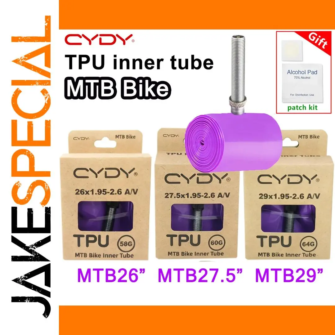 Experience the perfect mix of style and functionality with this vivid purple CYDY inner tube compatible with mountain bikes. Crafted from durable TPU material, it boasts a smooth, glossy finish that highlights its sleek rubbery texture. Designed for size versatility, it fits 26×1.95-2.6, 27.5×1.95-2.6, and 29×1.95-2.6 inch tires. The lightweight construction ranges from 58 grams for 26-inch, 60 grams for 27.5-inch, to 64 grams for 29-inch models, ensuring minimal weight for enhanced performance. The sturdy Schrader valve, 45mm in length, ensures a secure, airtight fit during inflation. This inner tube combines bold aesthetics with technical precision to boost your mountain biking experience, making every ride smoother, safer, and more stylish.