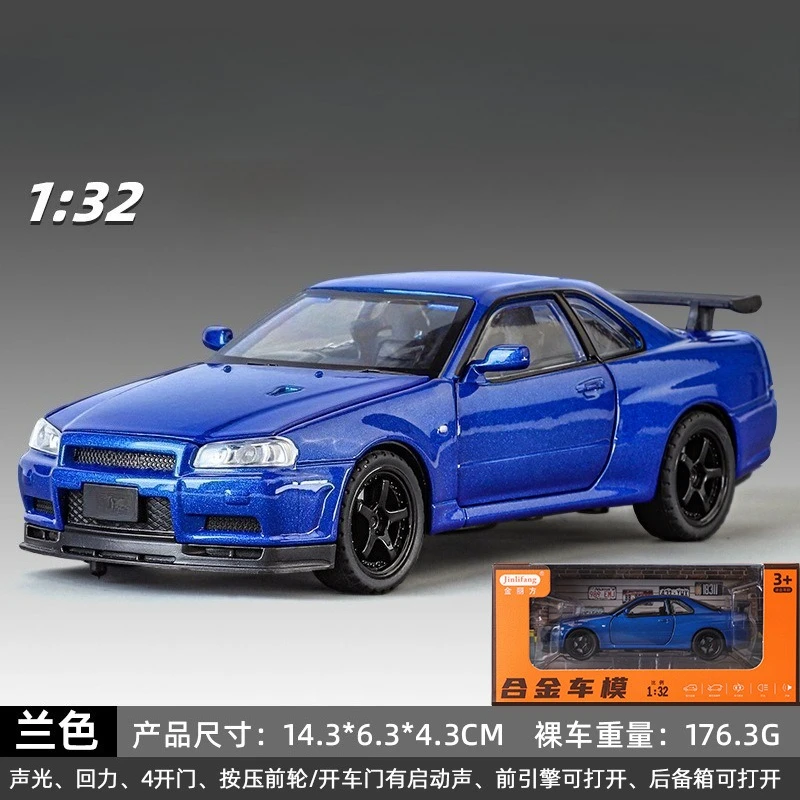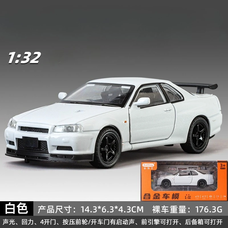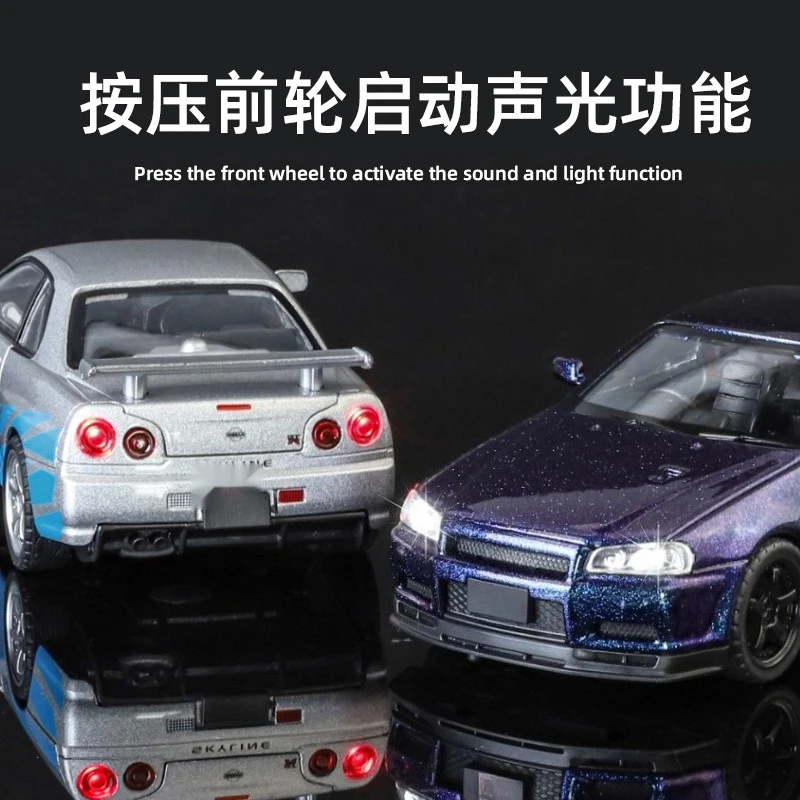 Experience the thrill of owning a detailed 1:32 scale diecast model of the iconic Nissan Skyline R34 supercar. Crafted from durable metal alloy, this vibrant purple version boasts a shimmering, sparkly finish that captures light perfectly and highlights its aerodynamic contours. Equipped with simulation sound and lighting features, it offers a realistic and engaging play experience or a striking display piece. The model features sleek, black multi-spoke wheels, a large rear spoiler with a blue accent, tinted windows, and meticulously detailed exterior elements. Available in multiple colors, it’s perfect for collectors and enthusiasts who appreciate both style and craftsmanship.