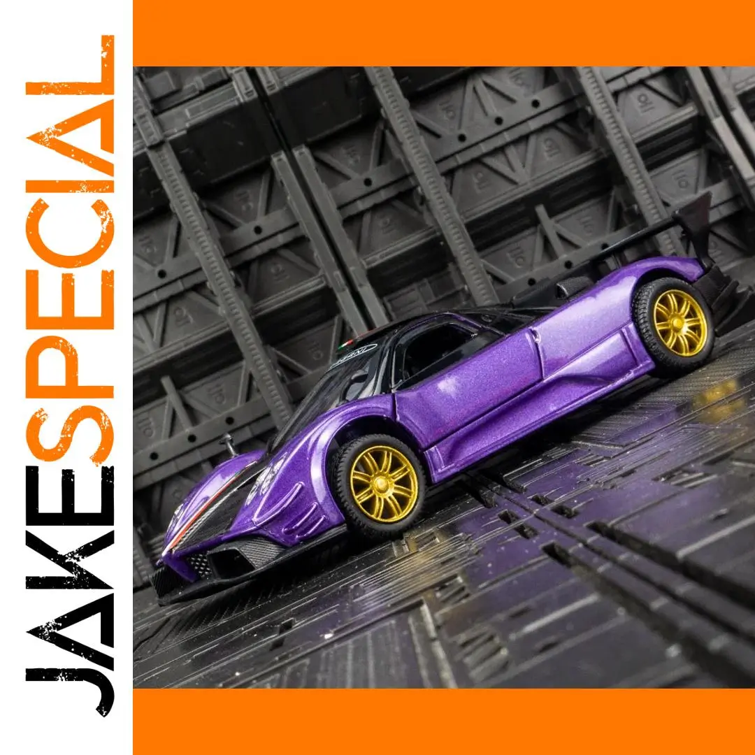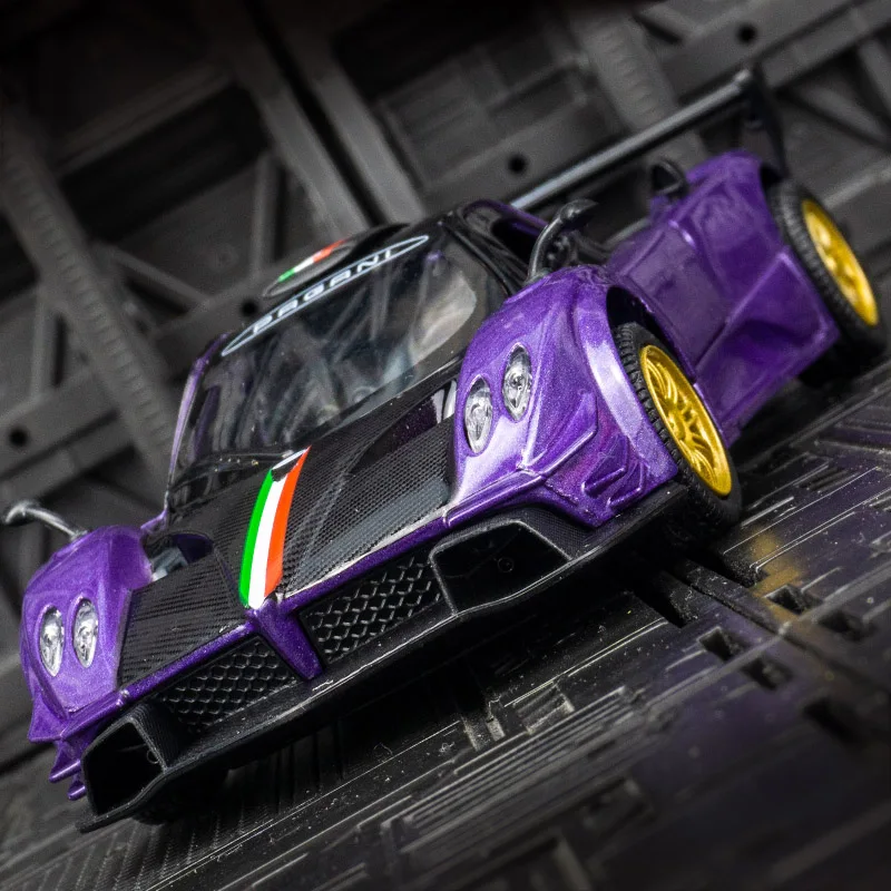 Imagine owning this eye-catching purple Pagani Zonda diecast alloy model, perfect for showcasing your passion for high-performance sports cars. Its vibrant metallic purple finish, complemented by sleek black roof and side windows, captures the vehicle’s dynamic style and aerodynamic silhouette. The vivid gold multi-spoke wheels and textured black tires add a luxurious and realistic touch. With functional headlights and taillights crafted from transparent plastic, this model mirrors real car lighting details. Designed for collectors and enthusiasts aged 6 to 18, this sturdy metal toy offers sound and light effects at the press of a button, creating an engaging experience. Its detailed craftsmanship and compact size make it an excellent decorative piece or gift for car lovers.