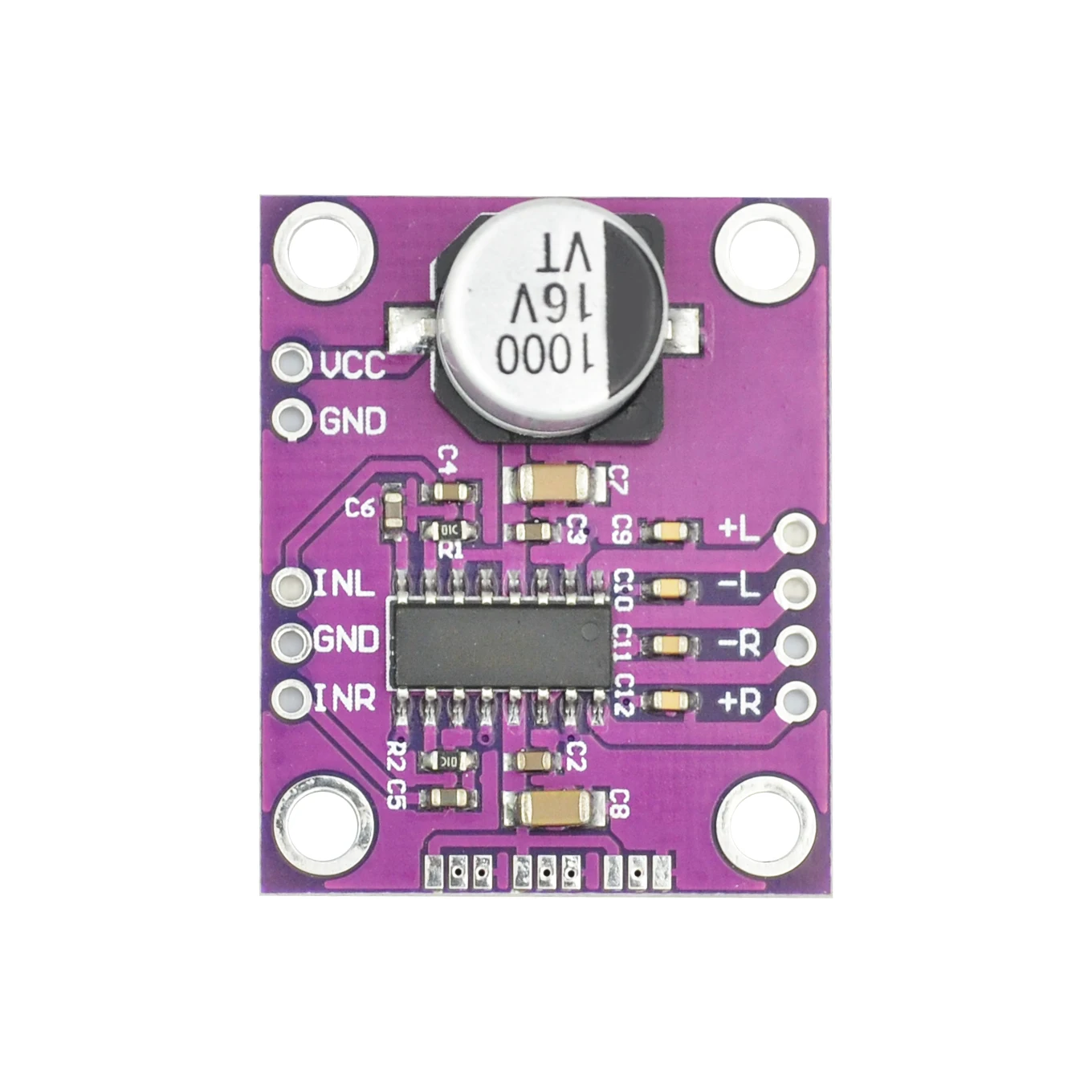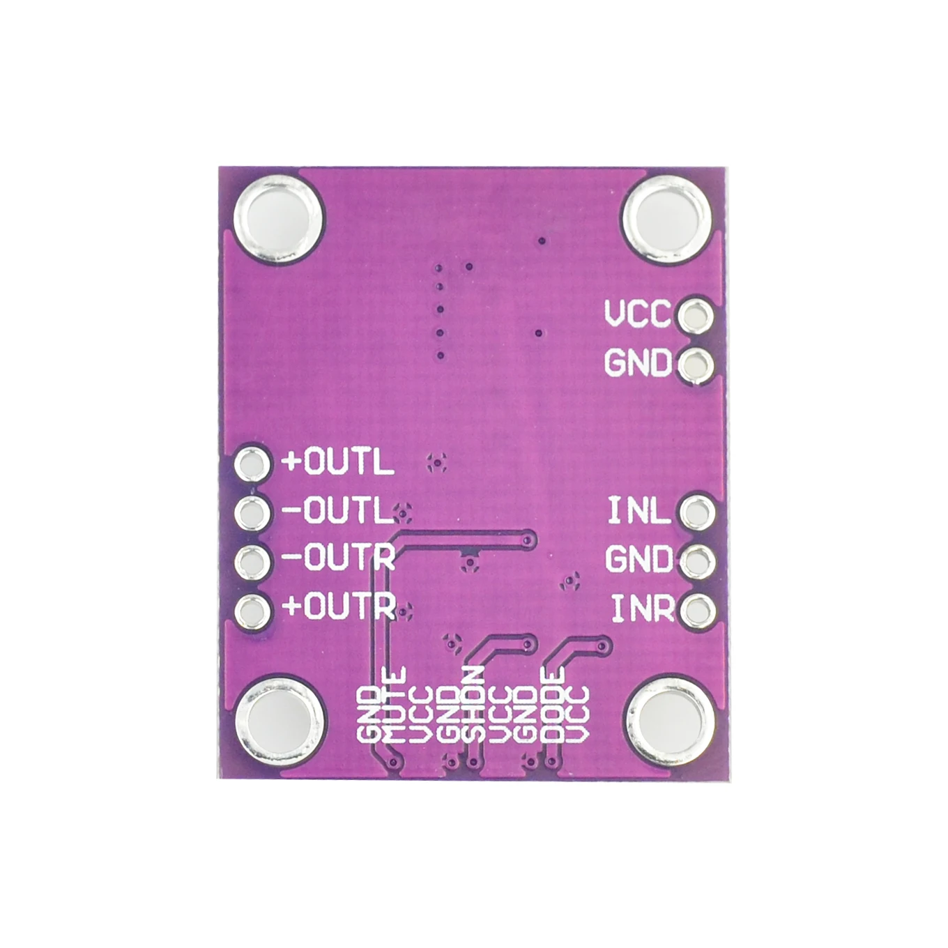 - Includes well-marked connection points such as VCC, GND, INL, INR, L+, L-, R+, R-, ensuring straightforward wiring and setup for seamless integration with audio sources and speakers.