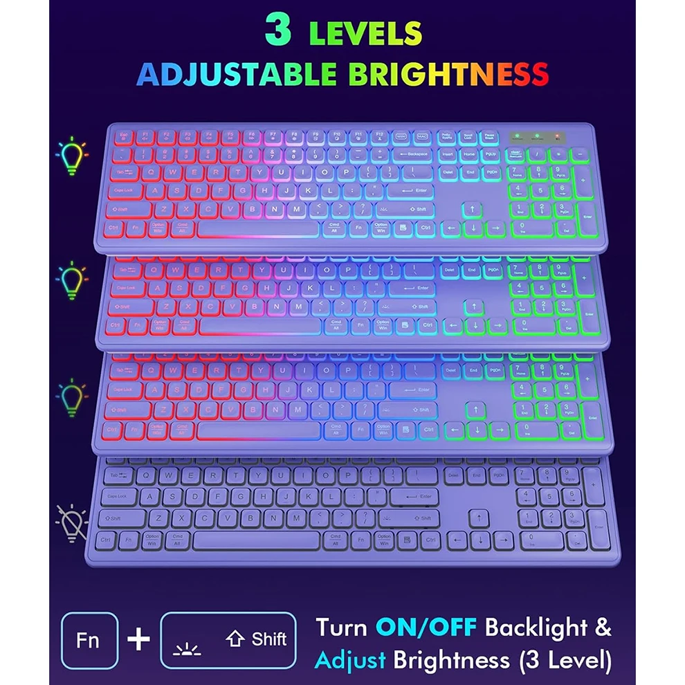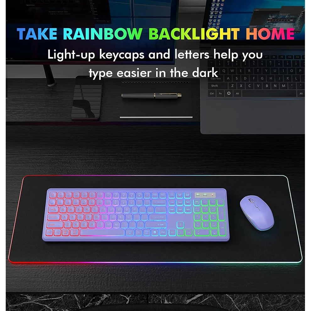 Enhance your workspace with this stylish, functional, and comfortable purple wireless keyboard and mouse combo. Its vibrant RGB lighting, ergonomic design, and reliable wireless connection make it an ideal choice for both work and leisure. Whether you're upgrading your existing setup or creating a fresh, modern look, this kit offers seamless compatibility, vibrant aesthetic appeal, and effortless control. Invest in this combo today to experience the perfect balance of beauty, comfort, and technology—transform your computing experience with a simple, elegant upgrade.