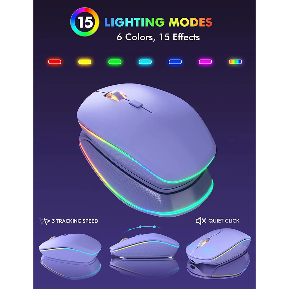 - Matching ergonomic mouse in pastel purple with an integrated RGB strip. It features 15 switchable lighting effects, contoured shape, and silent click buttons for smooth, noiseless operation.
