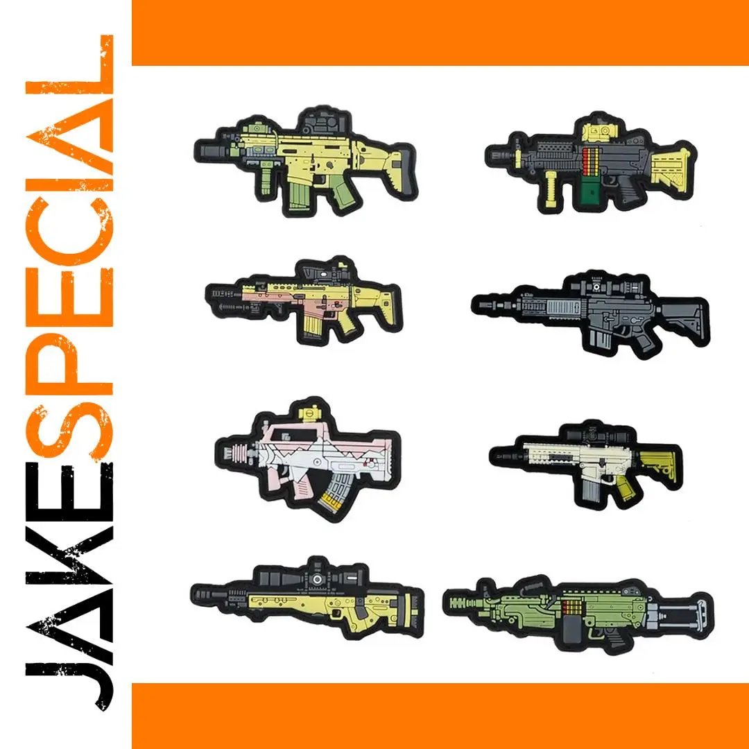 - Irregular shape follows stylized camouflage patterns with added design features like scopes, grips, and magazines for extra detail.