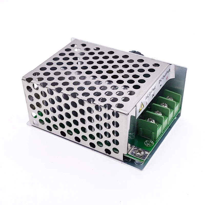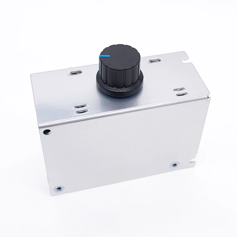 Experience precise control and reliability with this PWM motor speed controller, designed to seamlessly regulate DC motor speeds in various industrial and electronic applications. Crafted in a sturdy, matte-finished metal enclosure, its compact rectangular shape measures 85mm by 58mm by 38mm, emphasizing durability and functionality. The top surface features a perforated design with evenly spaced round ventilation holes, efficiently dissipating heat for prolonged use. The front panel displays clear, legible labels for easy wiring, including “AC INPUT” and “DC OUTPUT” terminals with green screw-type connectors. On the right side, a large black rotary potentiometer with a bright blue indicator line enables smooth speed adjustments over a 270-degree rotation, integrating a switch function for convenience. This highly utilitarian device ensures stable operation with overload protection through an integrated fuse, supporting a maximum current of 20A and continuous use at 10A. Perfect for controlling DC motors with variable speed needs.