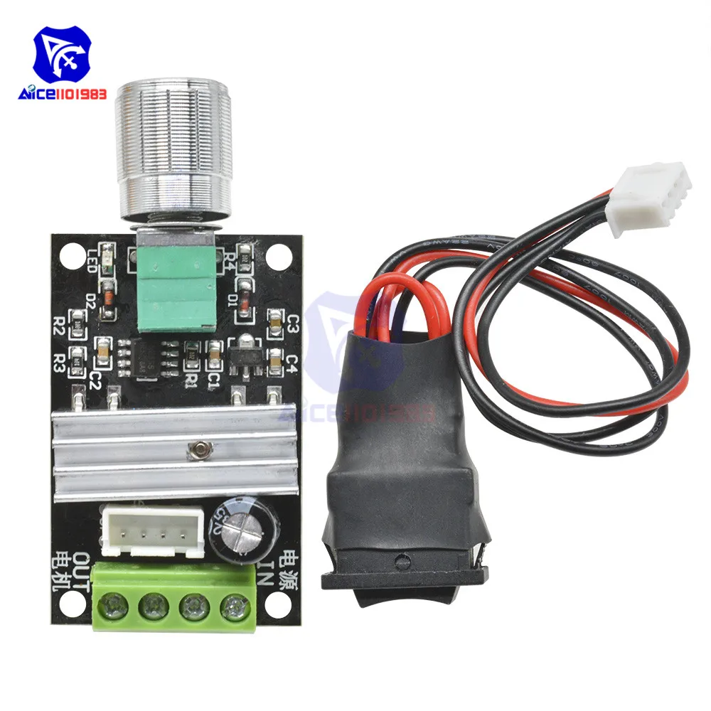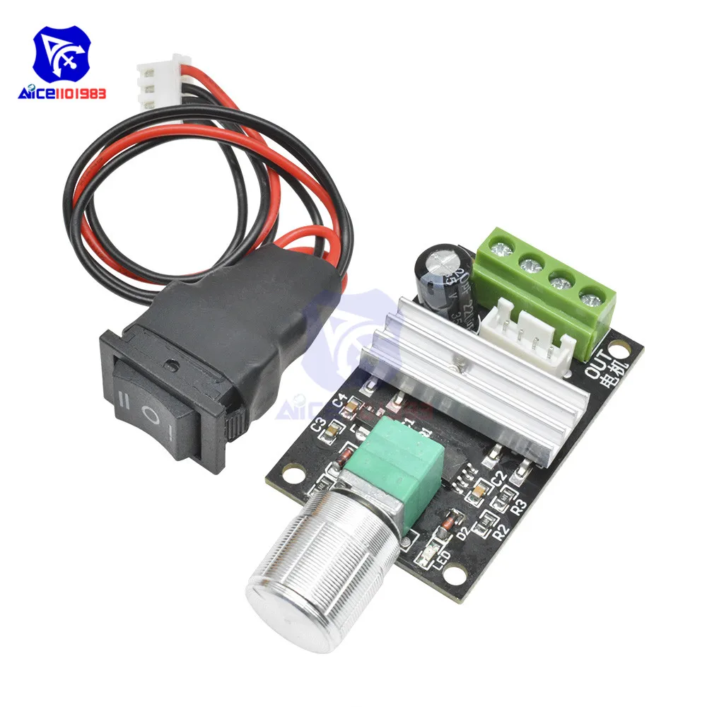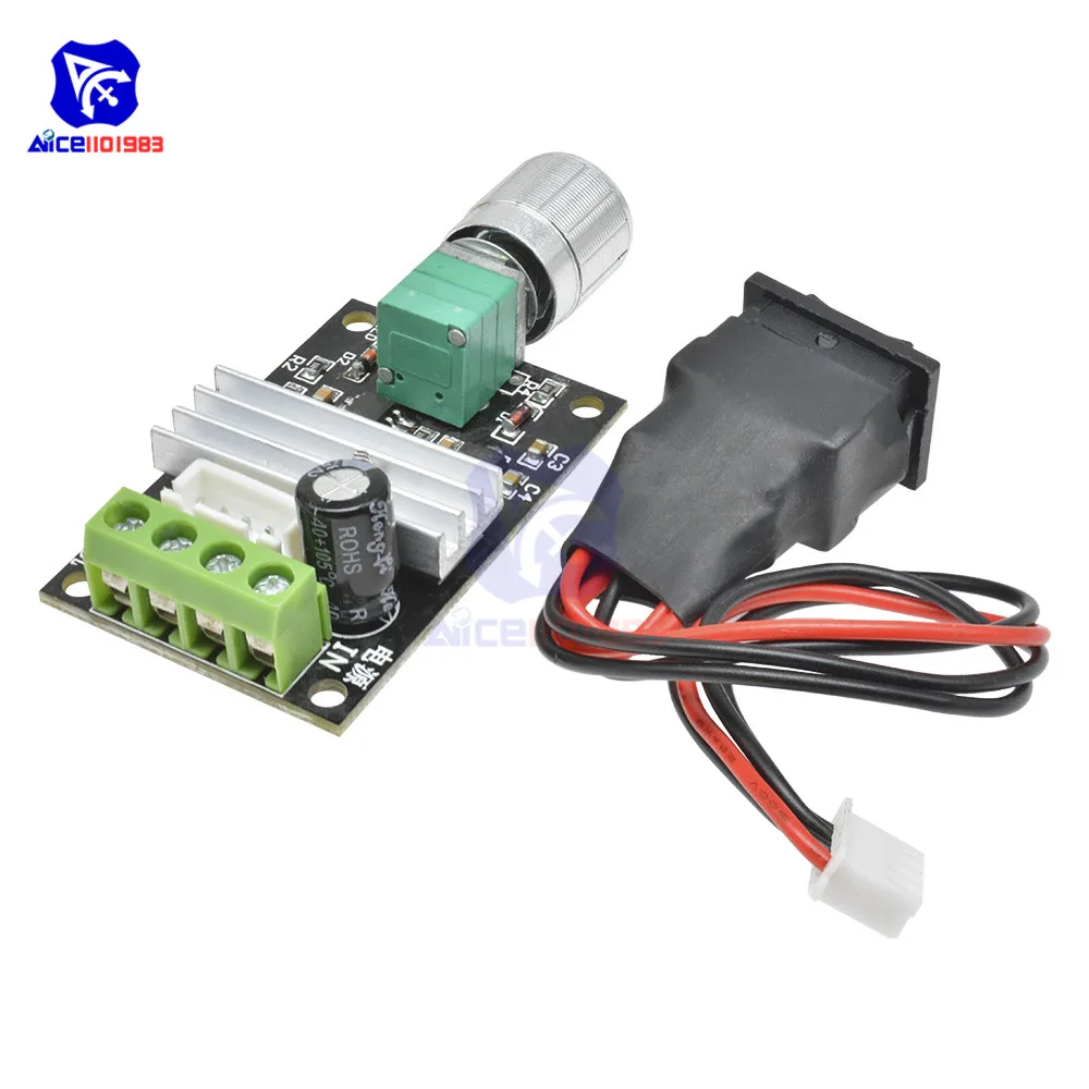 Experience precise control and reliability with this this PWM motor speed controller. Designed with a compact and robust metal housing, it seamlessly blends industrial strength with modern minimalism. The black circuit board features meticulously arranged electronic components, highlighting a clean, organized aesthetic. Bright green screw terminals add a vibrant touch of color, providing easy wiring connections. The large, textured metallic potentiometer knob offers effortless manual adjustment, while the toggle switch with a clear ON/OFF marking adds bold simplicity. With a tidy size of just 5 x 3.2 x 1.5 cm, this controller is perfect for small DC motor projects requiring adjustable, reversible operation. Its durable design ensures durability in diverse working environments, making it an essential addition for electronics enthusiasts and professionals alike.