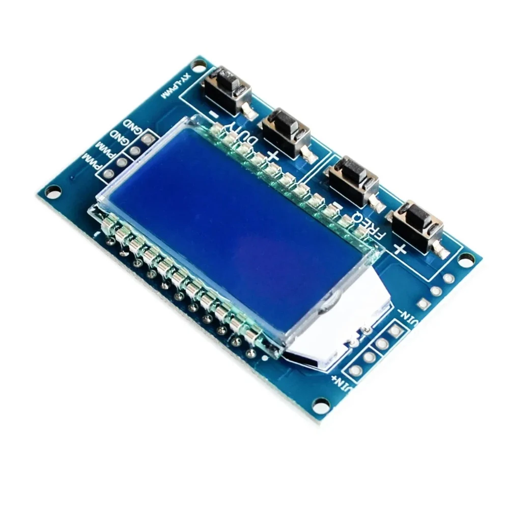 Experience precise control with this sleek PWM signal generator module, featuring a modern design with a dark matte casing and vibrant blue LCD display. Its minimalistic aesthetic combined with clear labels creates a high-tech look, perfect for professional setups. The module’s central LCD clearly shows frequency and duty cycle, framed for easy reading. Flanking the screen are four blue buttons, symmetrically placed for intuitive operation—two on each side—allowing rapid adjustments. Its streamlined, functional appearance complements its technical sophistication, making it ideal for experimentation, motor control, and circuit modulation. Whether you’re calibrating complex systems or fine-tuning signals, this module integrates seamlessly into your workflow, combining style with precision in a compact package. Visualize yourself easily adjusting parameters, confident in its reliability and sleek design, elevating your project’s execution.
