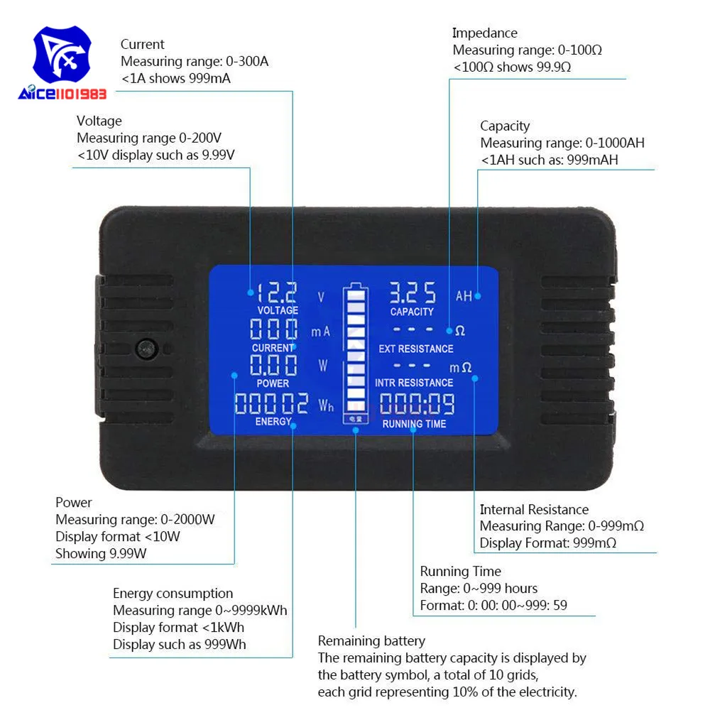 - Capable of measuring capacity up to 1000AH, power up to 2000W, energy consumption up to 9999kWh, and runtime from 0 to 999 hours, making it ideal for detailed battery analysis and circuit monitoring.