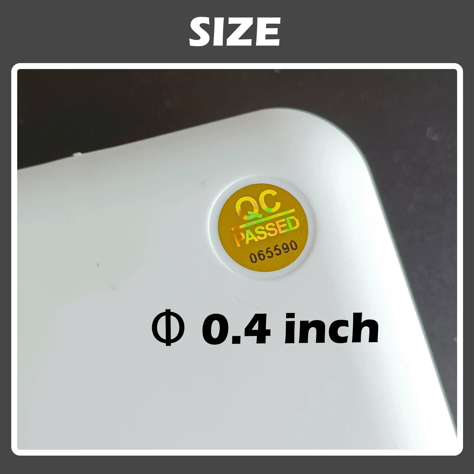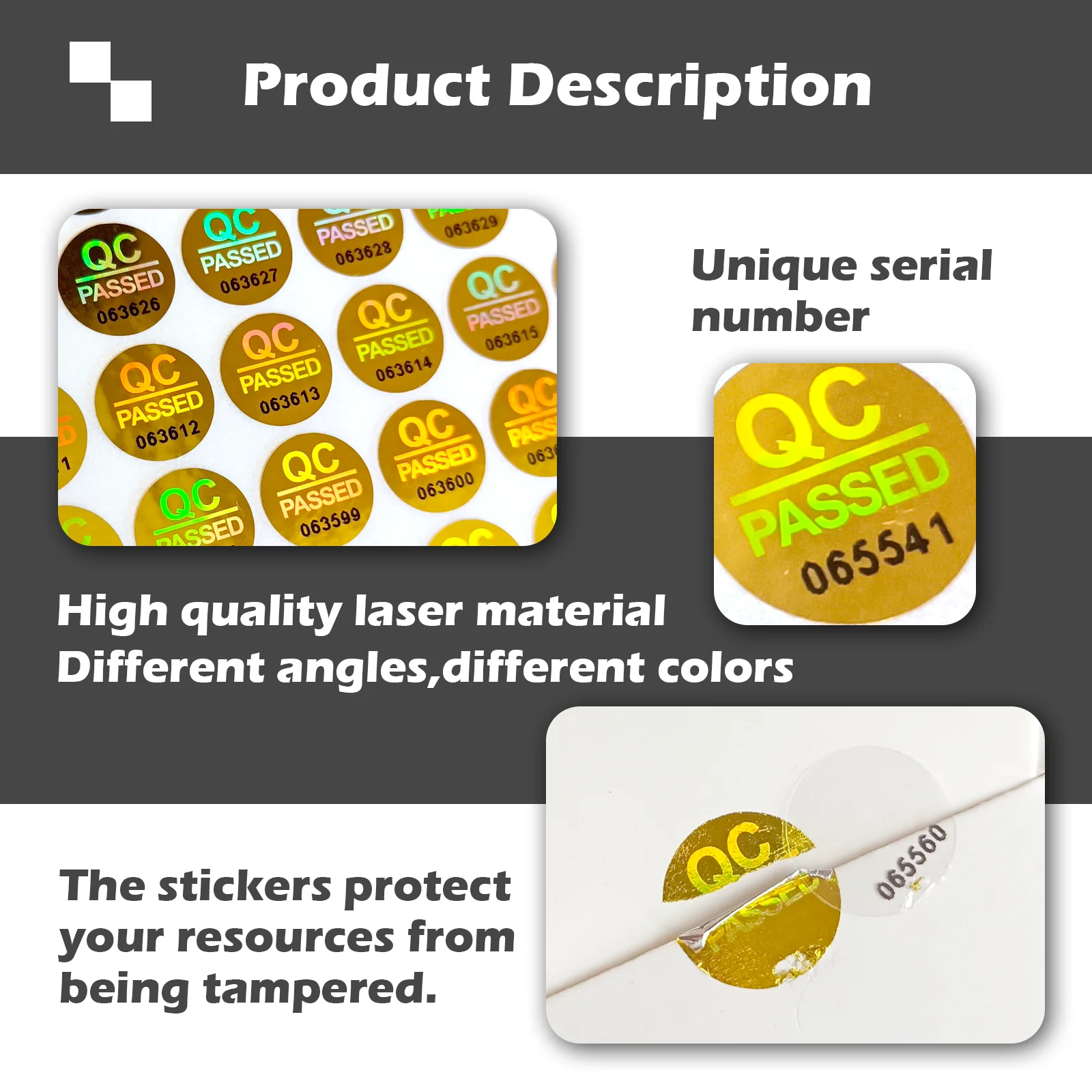 Enhance the security of your items with our QC Passed hologram label stickers. These tamper-evident stickers, available in both gold and silver, feature a unique sequential numbering system for easy identification. Made from durable plastic, they adhere well to various surfaces including paper, plastic, and steel, ensuring reliable protection. Once removed, these labels leave a permanent mark, indicating tampering and safeguarding your resources. Each purchase includes a generous quantity, allowing you to efficiently seal and protect multiple items. Invest in peace of mind today with these essential security labels for your collectibles or important documents.