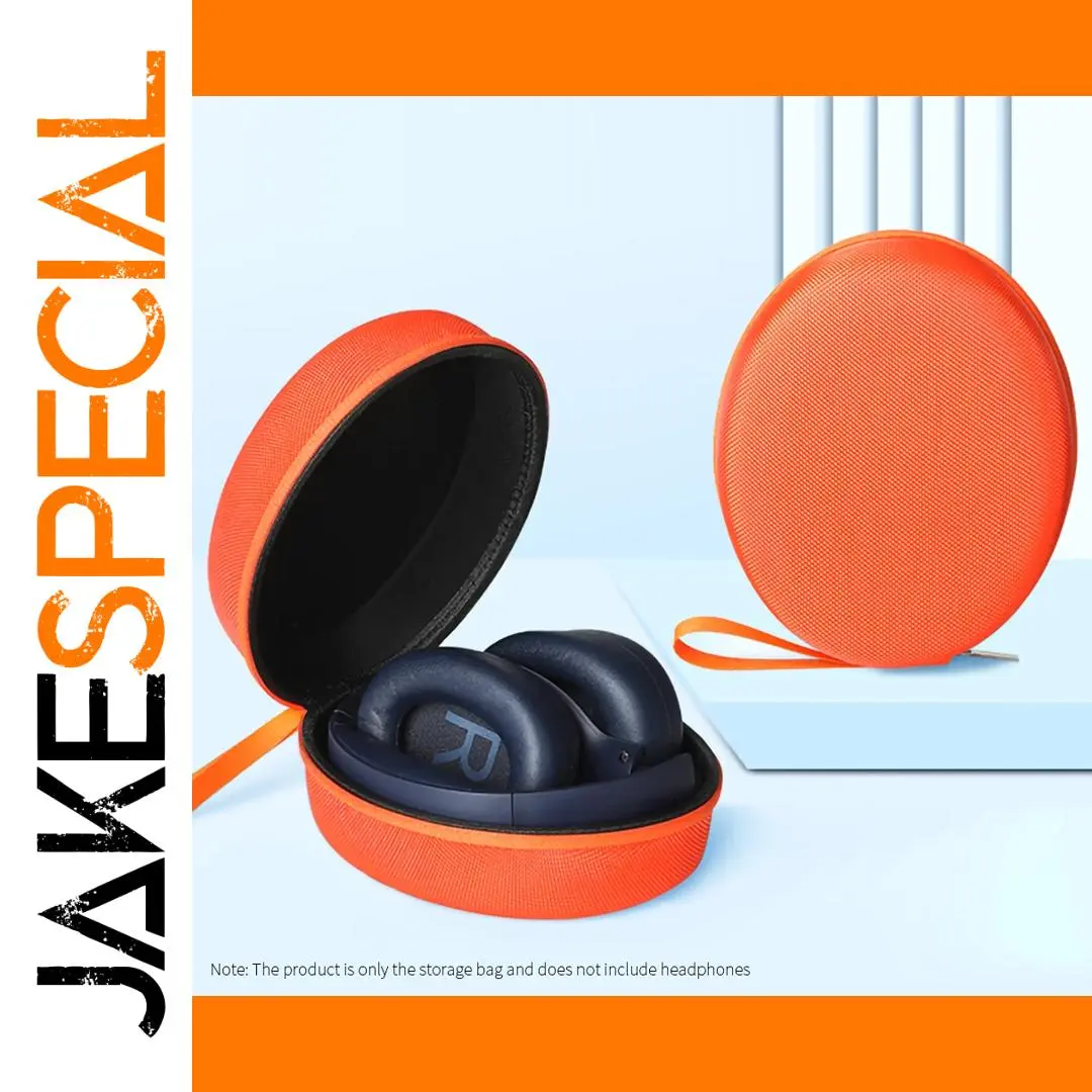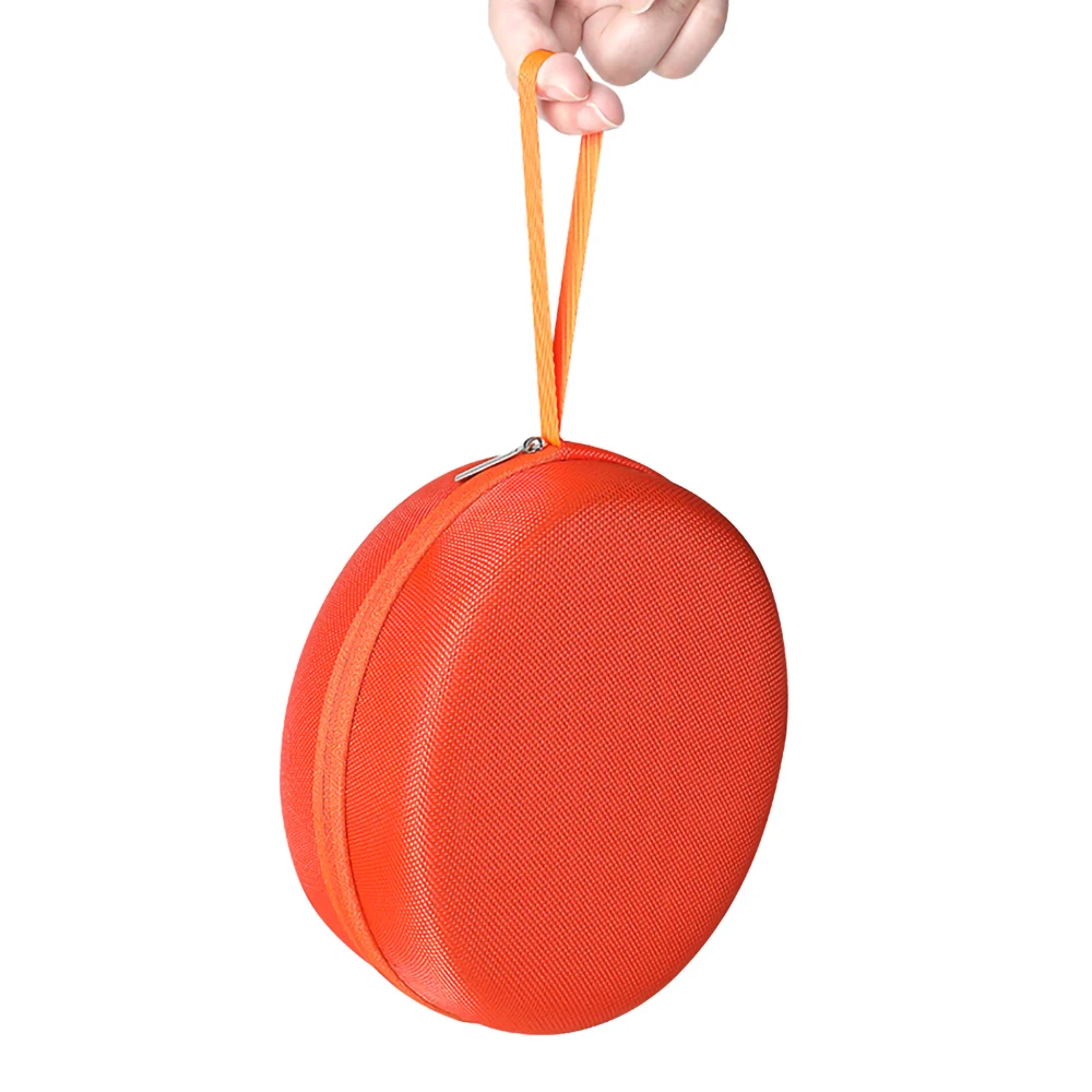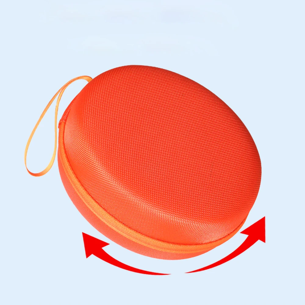 The Hard Storage Bag for QCY 20 Pro, Haylou S35 ANC, and similar-sized headphones features a vibrant orange exterior made of durable, pressure-resistant EVA material. Measuring 170mm x 145mm x 85mm, this compact case boasts a smooth, textured surface and a zippered opening for easy access. Inside, the soft navy blue lining protects your headphones, with plush ear cushions partially visible through the opening. A convenient fabric loop or strap enhances portability, making it perfect for travel. Available in orange, black, silver, and blue, this stylish case combines functionality and aesthetics for headphone enthusiasts.