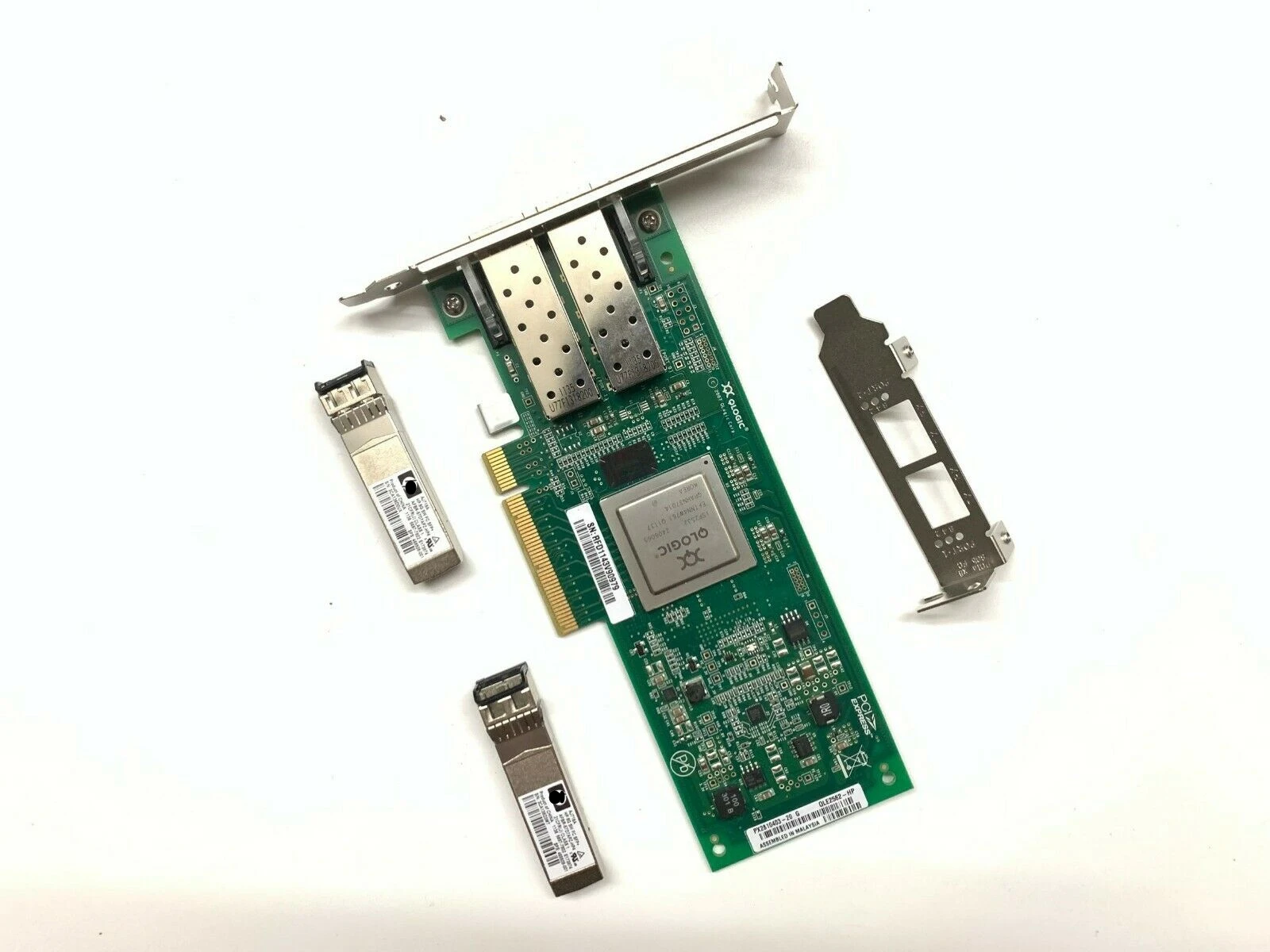 Experience high-performance connectivity with this sleek and industrial-designed QLogic QLE2562 PCIe Fibre Channel Host Bus Adapter. Featuring a vibrant green printed circuit board, it showcases a modern and professional aesthetic, enhanced by precisely arranged black surface-mount components that create a technical, organized look. The two silver-colored metal SFP port covers add a polished metallic contrast, highlighting its fiber optic connection capabilities. The central rectangular component marked “QLogic” underscores its robust processing power, while the gold-plated PCIe connector at the bottom offers a durable and reliable connection to your server or workstation. The printed white text enhances clarity and easy identification. This card combines style and ultimate function, making it an ideal choice for data centers or enterprise environments requiring dependable, high-speed fibre channel connectivity.