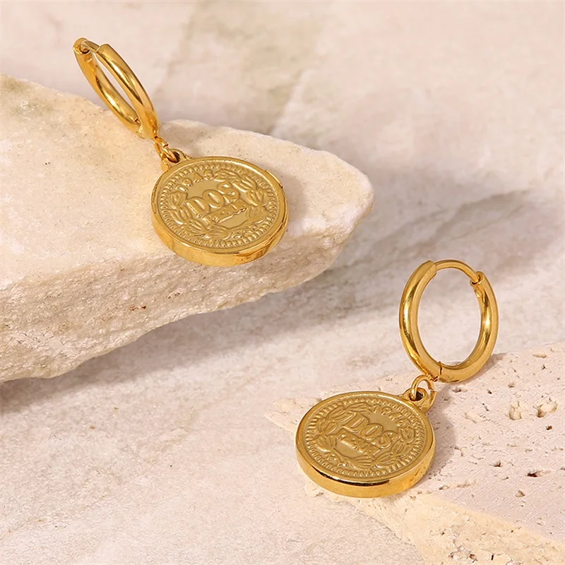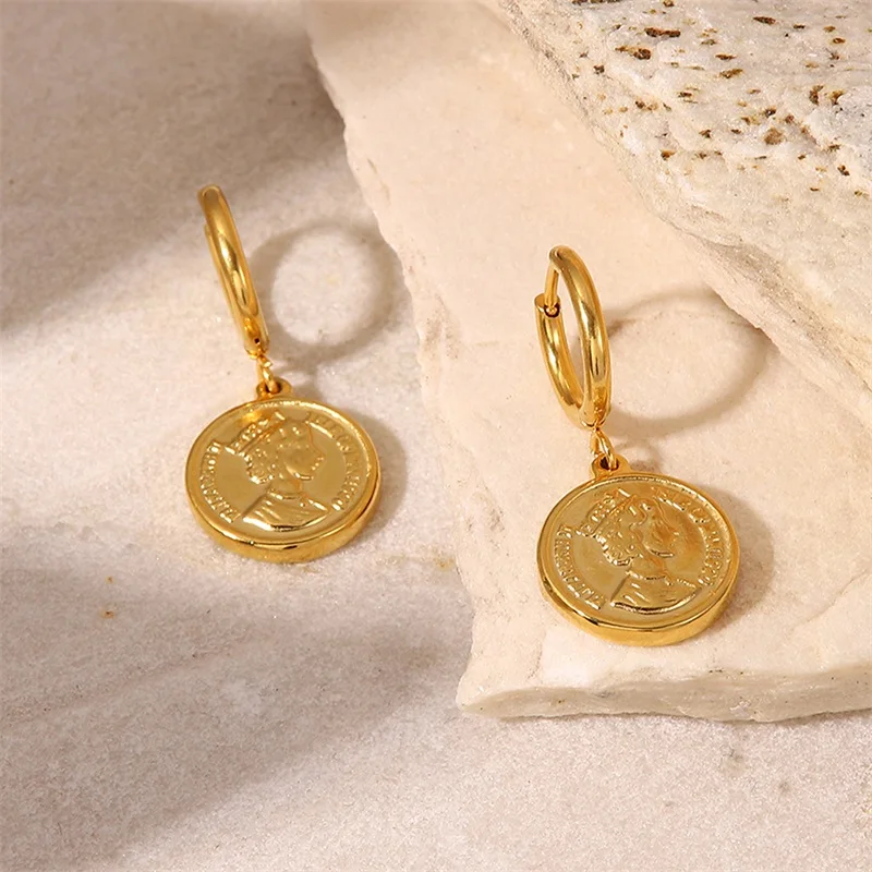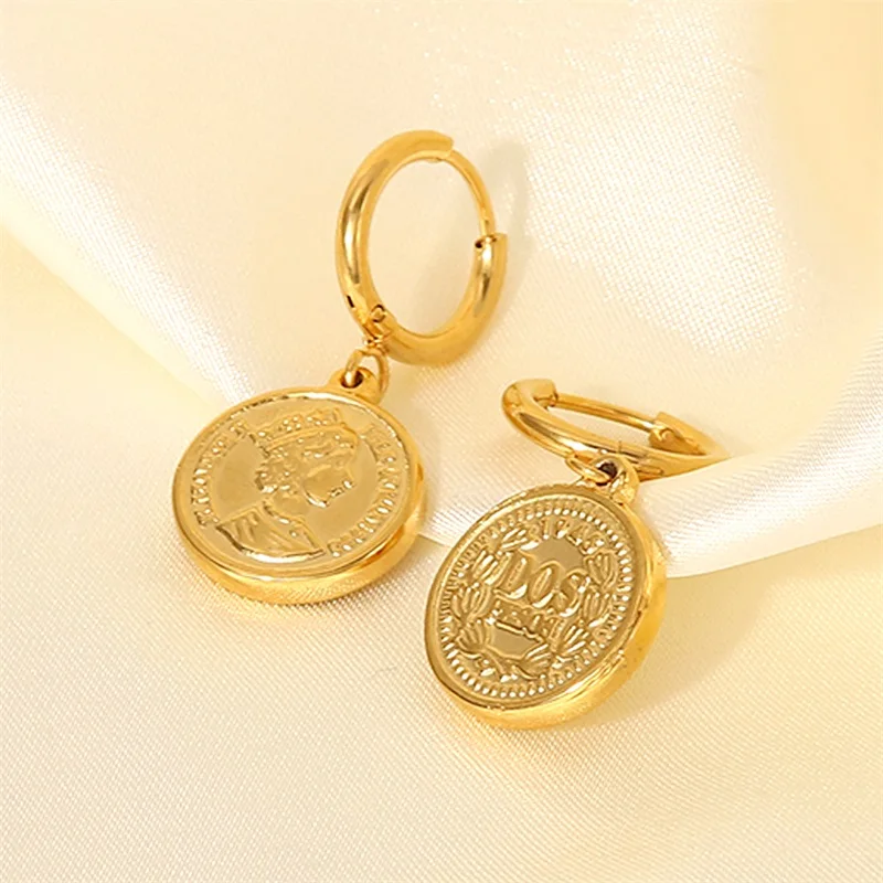 Experience the elegance of these queen-inspired stainless steel earrings that blend vintage charm with modern sophistication. Featuring 20mm round pendants, each pair showcases a detailed embossed portrait of Queen Elizabeth, highlighting her regal features, hairstyle, and crown. The gold-toned polished finish adds a warm, luxurious glow, making these earrings perfect for elevating any outfit. Designed for comfort, the lightweight construction and 25mm oval hooks ensure a secure, comfortable fit throughout your day. These versatile earrings are ideal for both formal events and casual outings, offering a unique statement of timeless beauty and royal elegance. Embrace your style with jewelry that exudes heritage and sophistication.