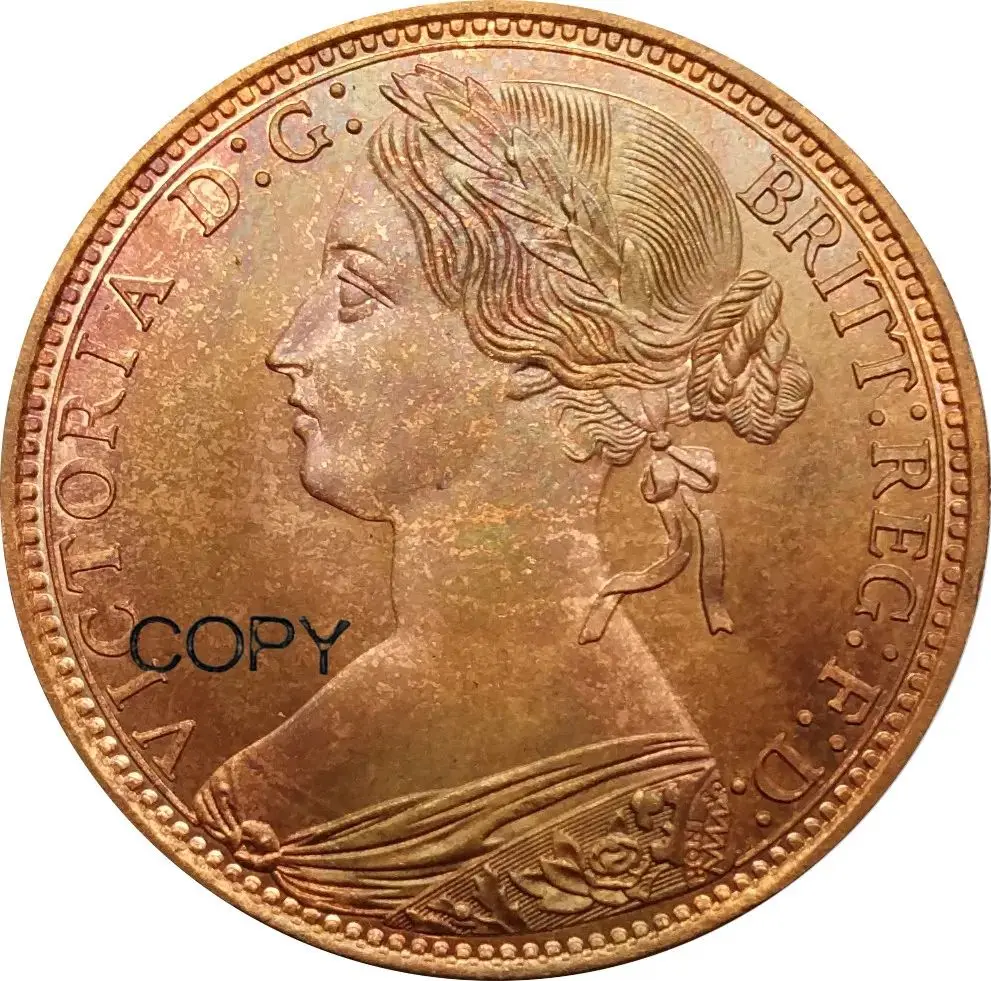 Step into history with this exquisite replica coin commemorating Queen Victoria from 1881. Crafted to mimic antique charm, it features a rich reddish-brown metallic hue and a textured, aged surface that evokes vintage coin aesthetics. The detailed relief shows Queen Victoria in profile, dressed in classical attire, wearing a helmet with a plume, seated on a chariot wheel, symbolizing her regal authority. Surrounding her are maritime symbols—a lighthouse or tower and a sailing ship—that emphasize a colonial and maritime theme. The coin is framed by a beaded border, with “ONE PENCE” curved along the top and the year “1881” prominently displayed beneath the figure, making it a perfect collectible for history enthusiasts or vintage coin lovers.