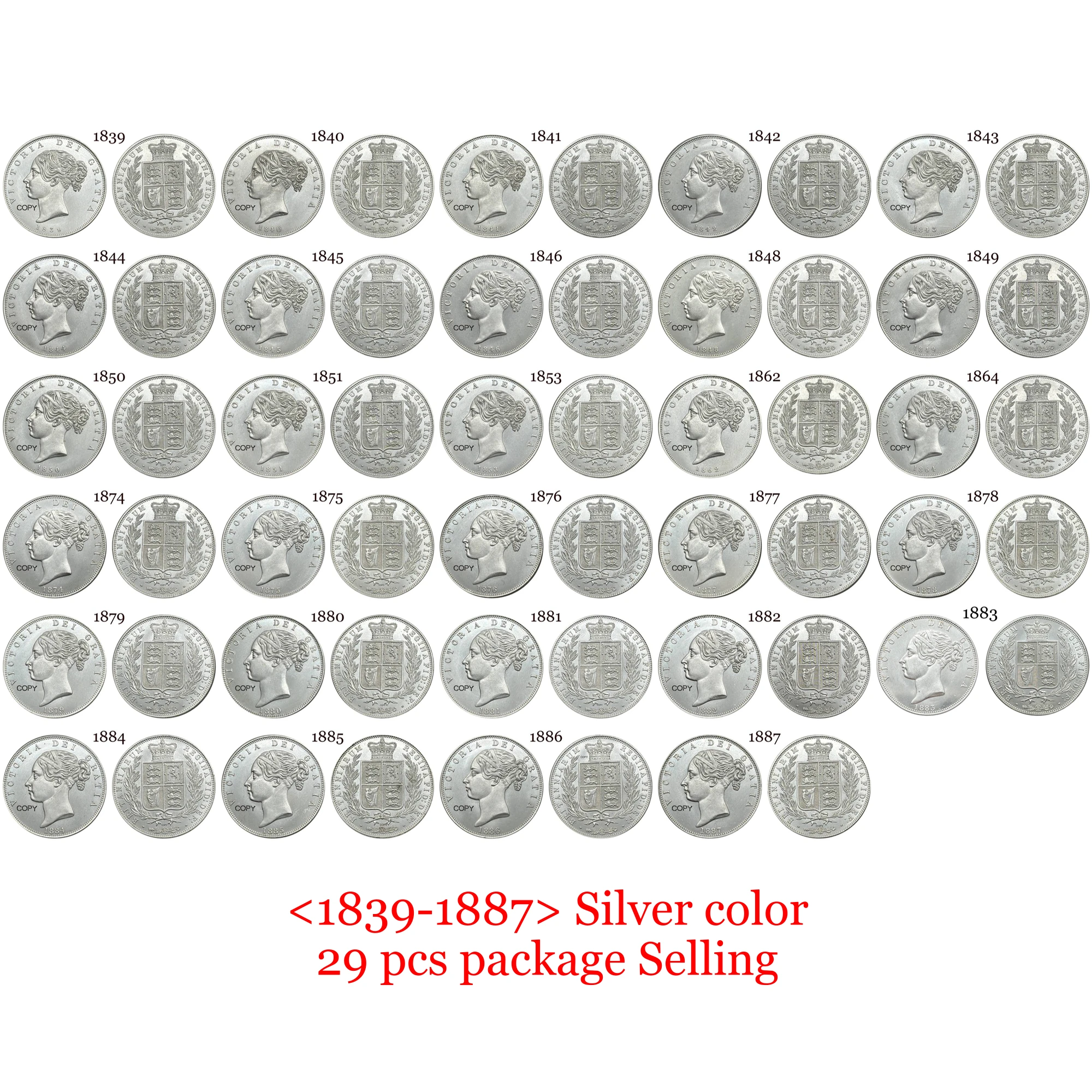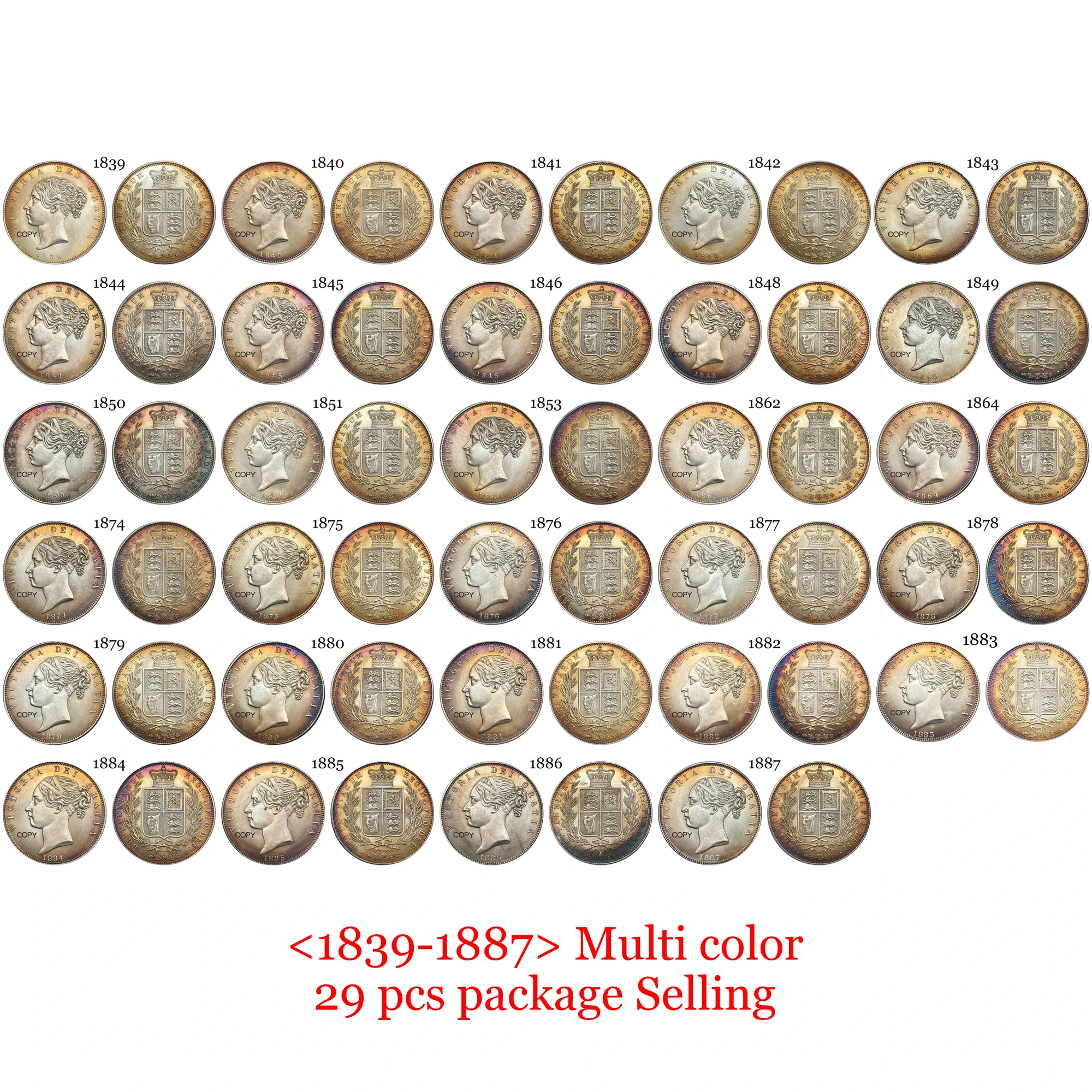 - 29 high-quality replica coins, dating from 1839 to 1887, crafted with precise details to replicate historical British half crowns for collectors' enjoyment.