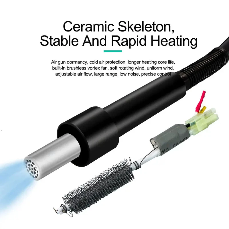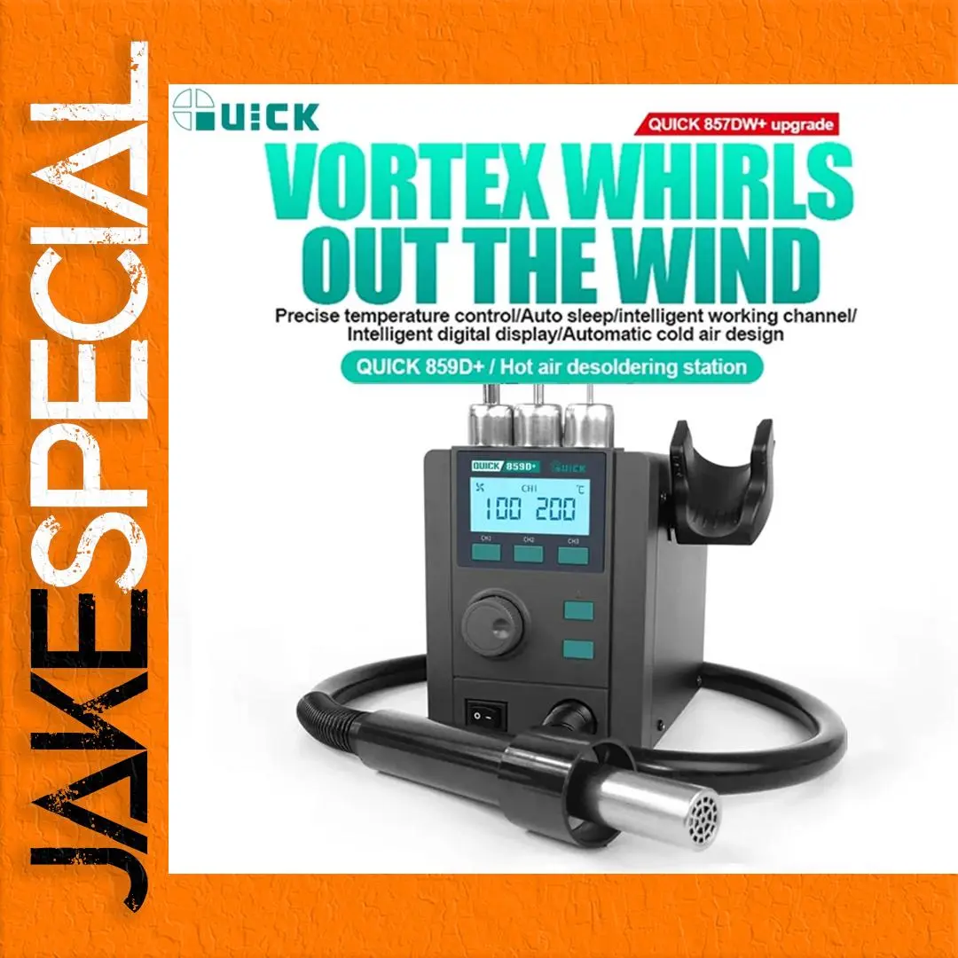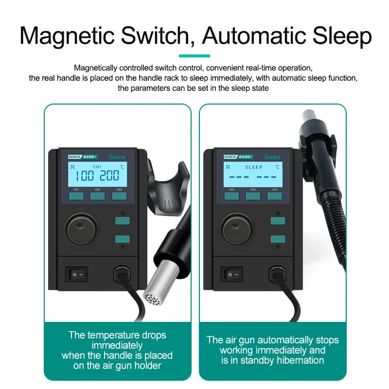 Experience precise and efficient desoldering with the QUICK 859D+ hot air rework station, featuring a powerful 580W output with peak power of 750W and operating at 220V (110V options available). Its compact design measures 110mm x 180mm x 151mm and weighs approximately 1.6kg. The station boasts a bright blue LCD digital display for easy adjustments, with a temperature range from 100°C to 500°C and adjustable airflow up to 40L/min across 1-100 levels. Equipped with a ceramic skeleton for rapid heating, a stainless steel air outlet, and a brushless vortex fan for quiet, uniform airflow, plus advanced features like automatic sleep, password protection, preset channels, and intelligent cold air protection, making it ideal for professional electronic repairs.
