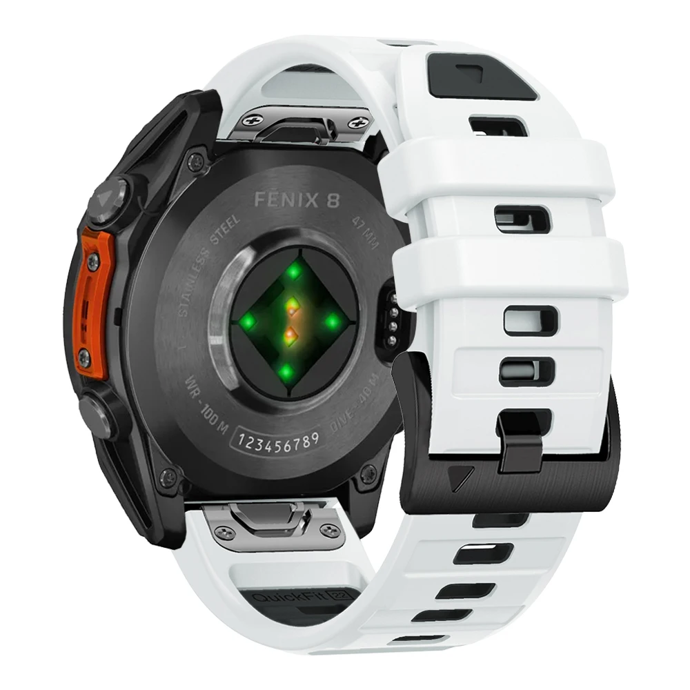 Imagine seamlessly enhancing your Garmin Fenix 7, 8, or Epix Pro with the QuickFit 26mm/22mm Two-Tone Silicone Strap. Designed for both style and comfort, this unisex band features an official buckle for secure wear during any activity. The soft silicone material ensures a smooth feel against your wrist, while the precise fit caters to various Garmin models including Fenix 6, 7, and Descent series. Its distinct color combination adds a touch of flair, making it perfect for casual outings or workouts alike. Elevate your watch experience and showcase your personal style effortlessly with this easy-to-install band.