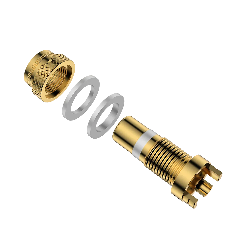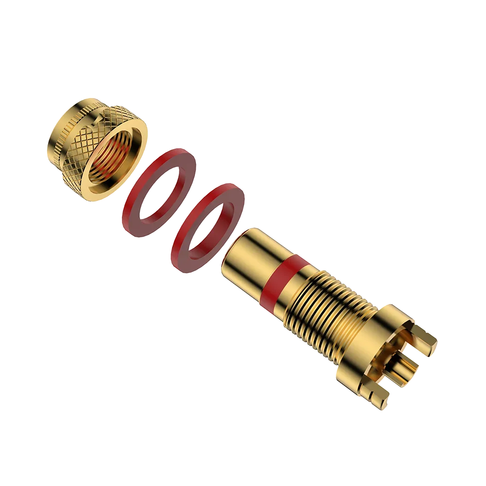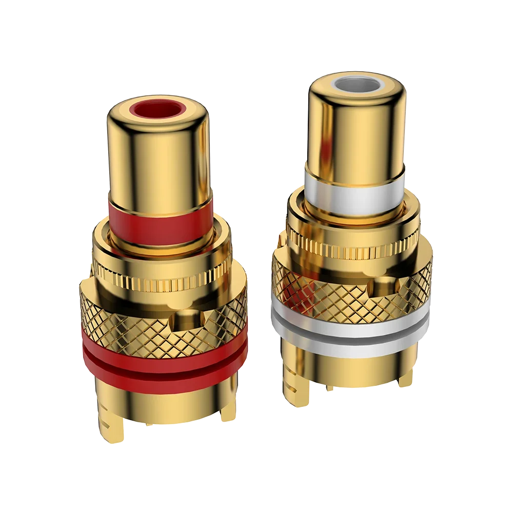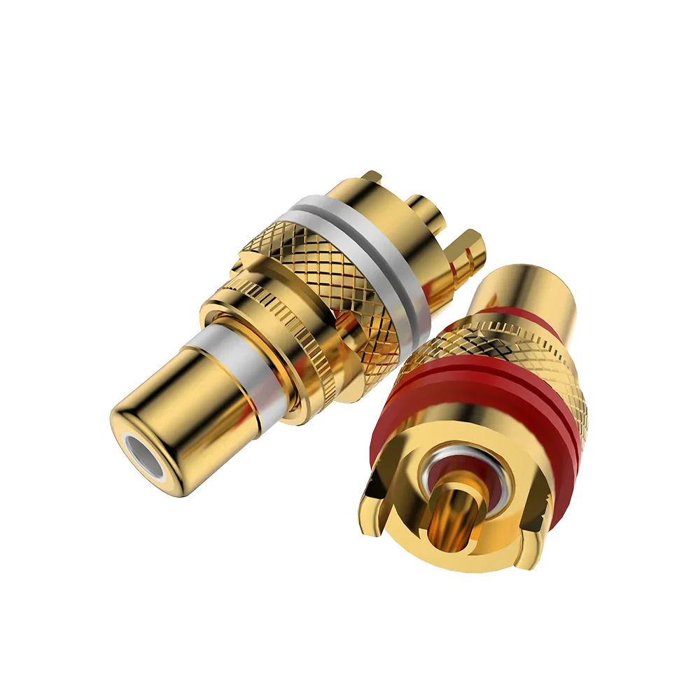 Experience superior sound quality and reliable connections with this premium R205 RCA female socket. Crafted from pure copper and plated with durable gold, it ensures lossless transfer of audio signals for a clean, crisp experience. The sleek, cylindrical design boasts a reflective gold finish that exudes elegance and durability, making it perfect for high-end audio setups. Its textured knurled midsection allows for easy installation and adjustment, while the inner openings with red and white linings clearly designate the right and left channels for stereo clarity. Designed for seamless integration into your existing system, these connectors are built to last, providing consistent, high-performance connections for your HiFi, TV, CD player, or amplifier.