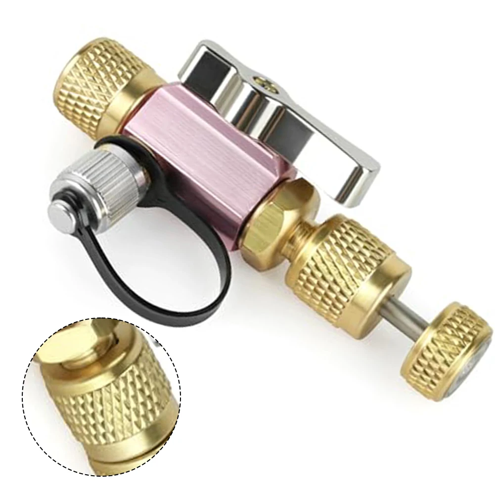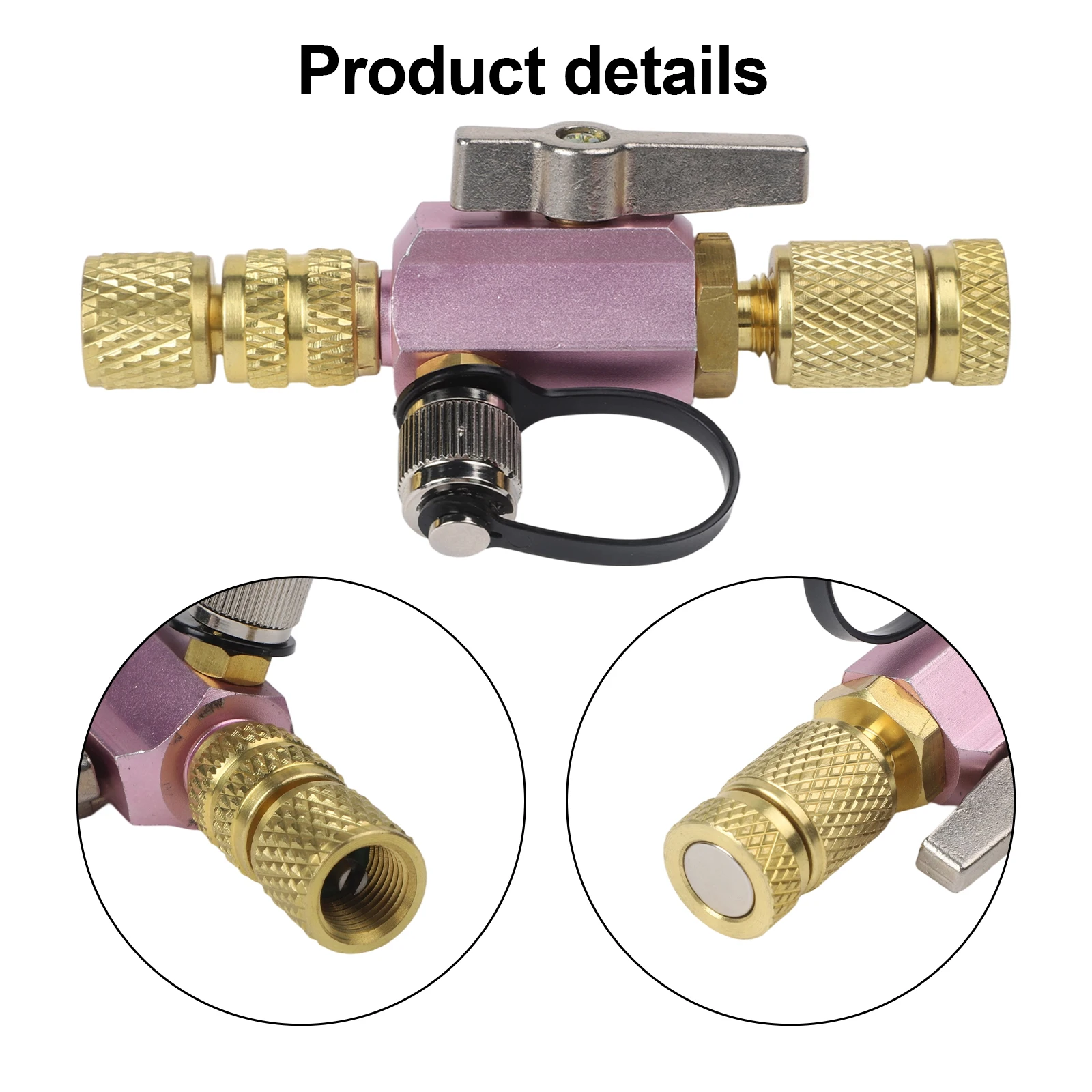 Experience ultimate efficiency with this precision-designed R410A Vacuum-Rated Valve Core Removal Tool. Crafted from durable brass and plastic, it features a sleek, gold-toned body complemented by textured knurled grips for easy handling. The contrasting pinkish-bronze-colored section adds a subtle aesthetic touch, while the polished stainless steel connection point enhances durability and reflection. The built-in ball valve handle, finished in matte metallic, ensures smooth operation and accurate sealing thanks to its double O-ring seal. An integrated vacuum gauge port with a side-mounted 14-port allows for precise pressure monitoring during maintenance tasks. Its compatibility with standard 5/16″ female flare and 1/4″ male flare connections makes it an essential tool for HVAC professionals seeking high performance and reliability in R410A split systems.
