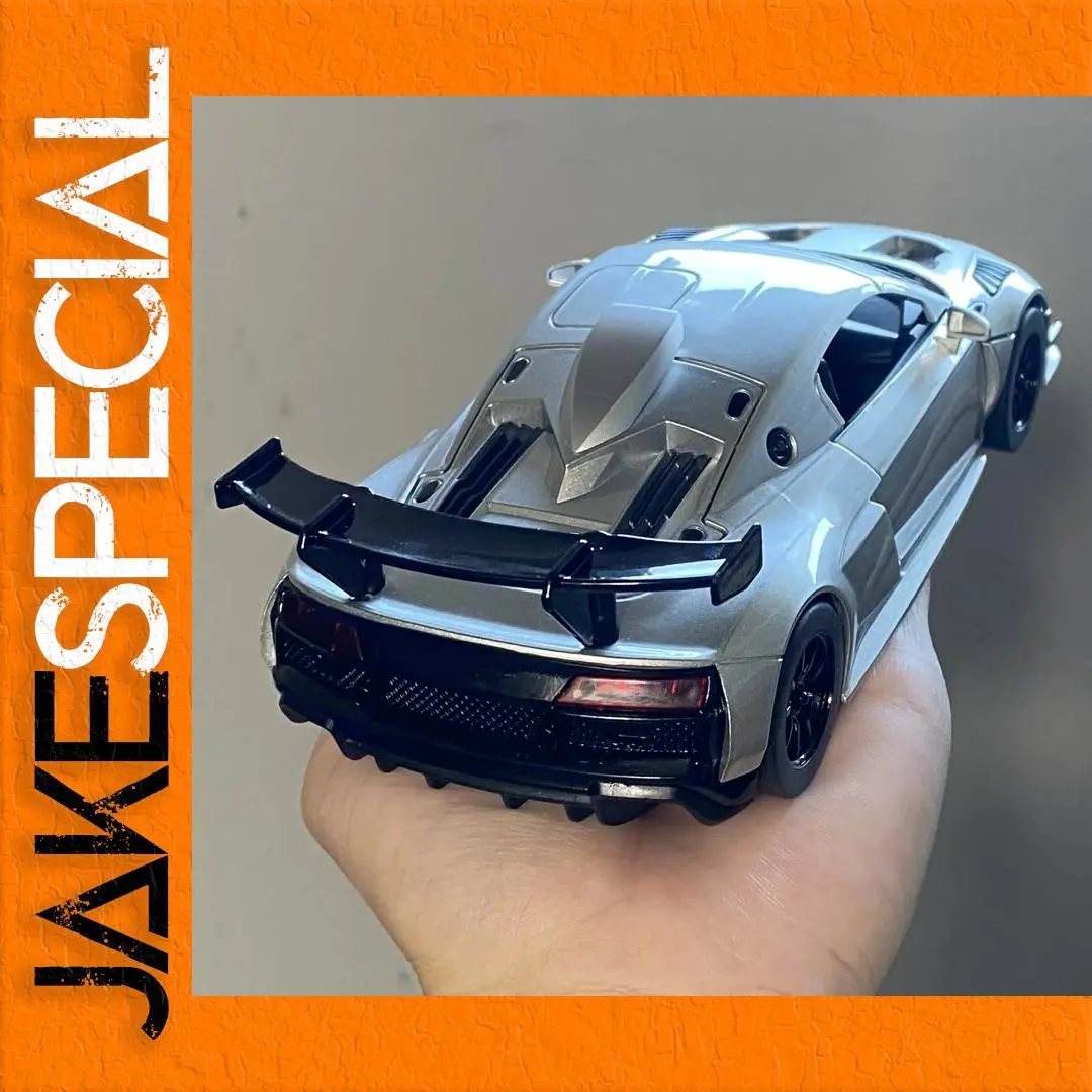 Experience the thrill of owning this stunning 1:24 scale die-cast model of the R8 LMS GT2 Super Sports Car. With its high-gloss silver finish, this beautifully crafted model captures the essence of speed and luxury. Expertly built from durable metal, it features intricate detailing, including mesh grille work and finely designed side vents. The model's racing spirit is amplified by a sporty black rear spoiler and meticulously designed black wheels. Enjoy the added fun of sound effects and light functionality, bringing the car to life in your collection. With pull-back action, simply imagine the excitement as you send it zipping across your display. This piece is destined to be a prized addition to any enthusiast's collection.