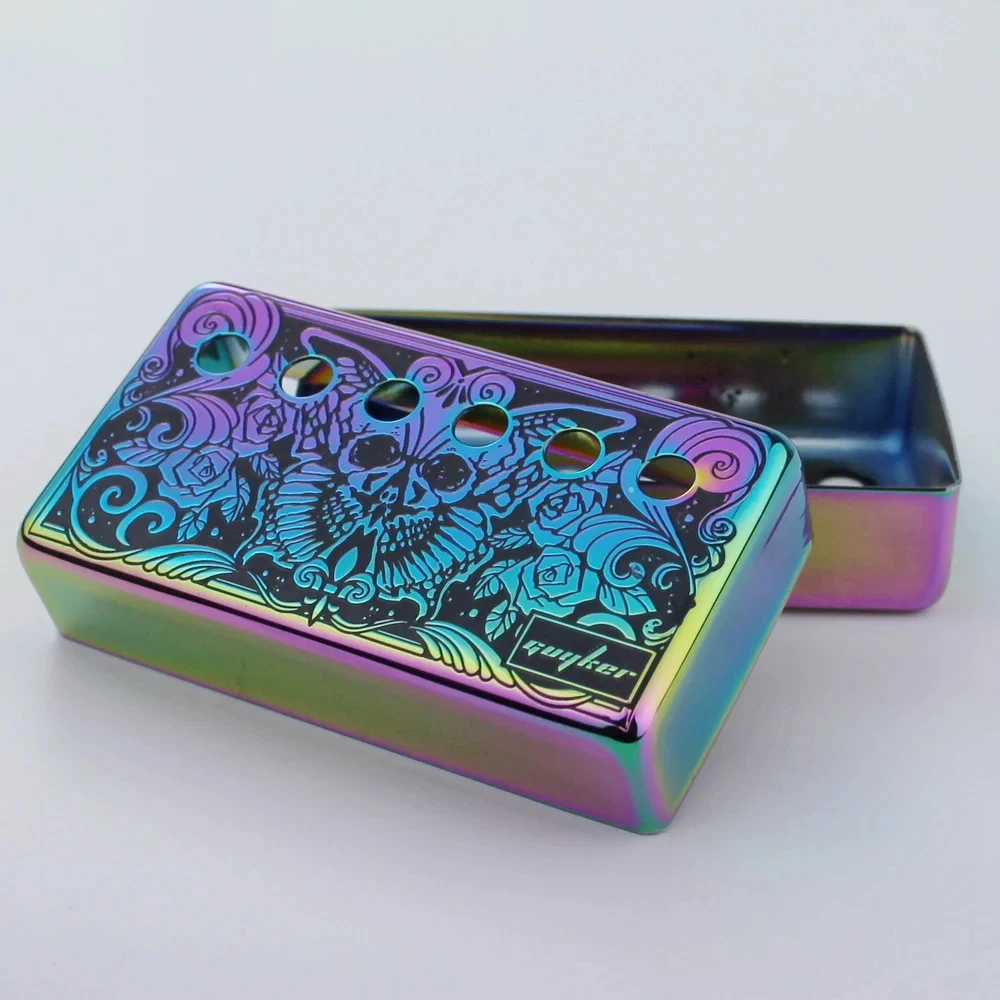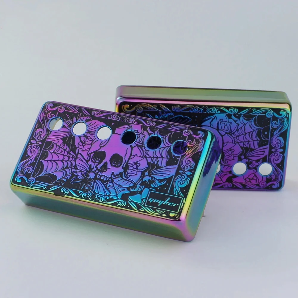 Immerse yourself in the vibrant transformation of your guitar’s look with this this set of rainbow chameleon pickup covers. Crafted from durable cupronickel, these covers feature a highly reflective metallic finish that shifts through a mesmerizing rainbow spectrum of purple, green, blue, and yellow hues. The main cover displays intricate black line art of a moth or butterfly, adorned with floral patterns and a small skull, creating a bold contrast against the shimmering background. Designed to fit LP-style guitars, they are perfect for replacing old or damaged pickups or customizing your guitar’s style. Make your instrument truly stand out with these artistic, eye-catching accessories that blend beauty and functionality seamlessly.