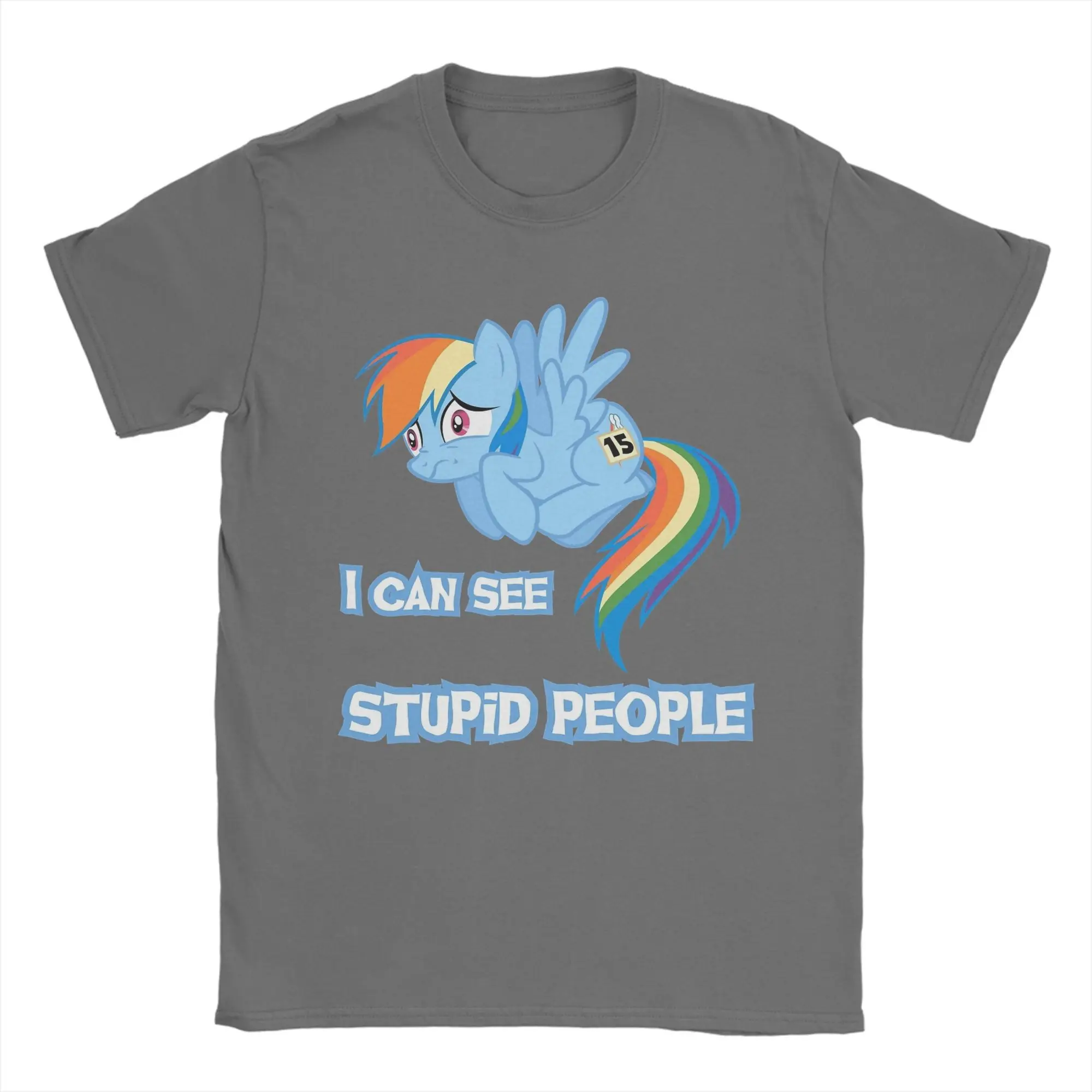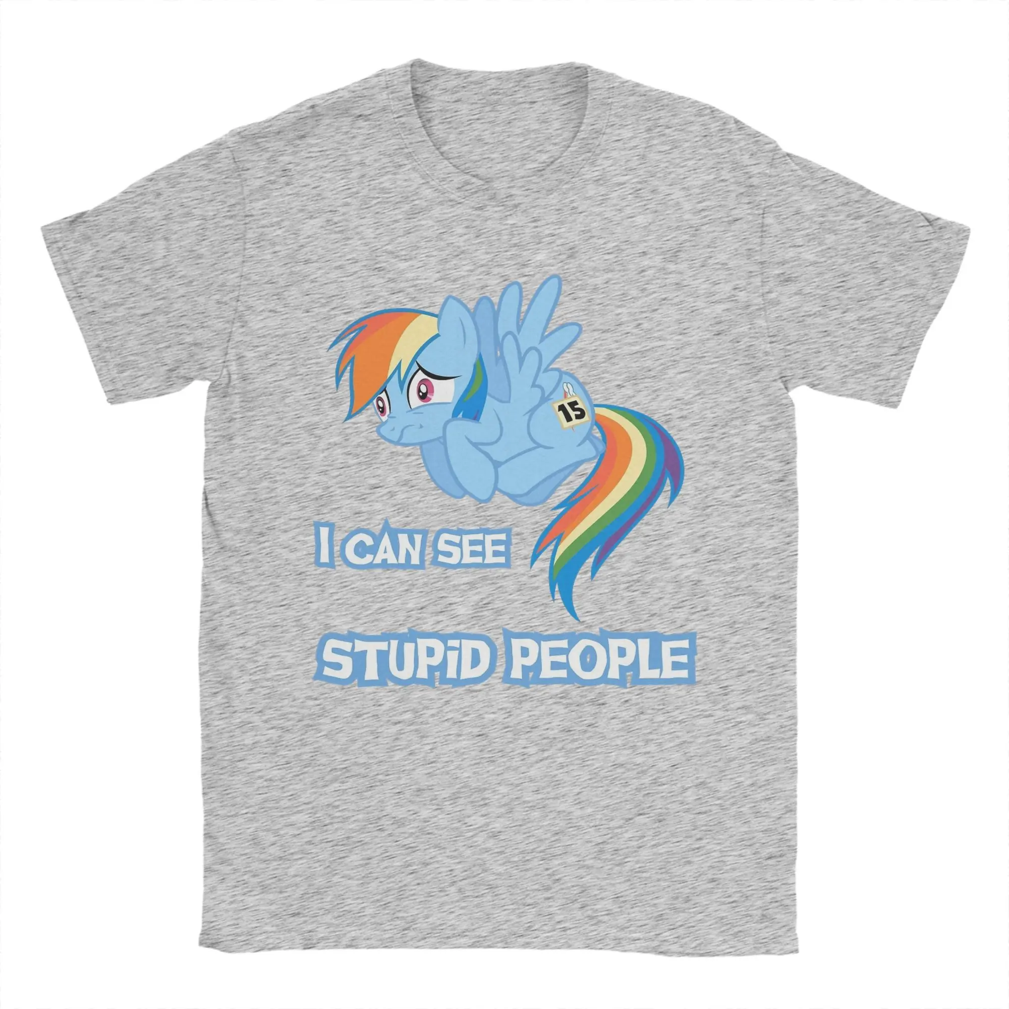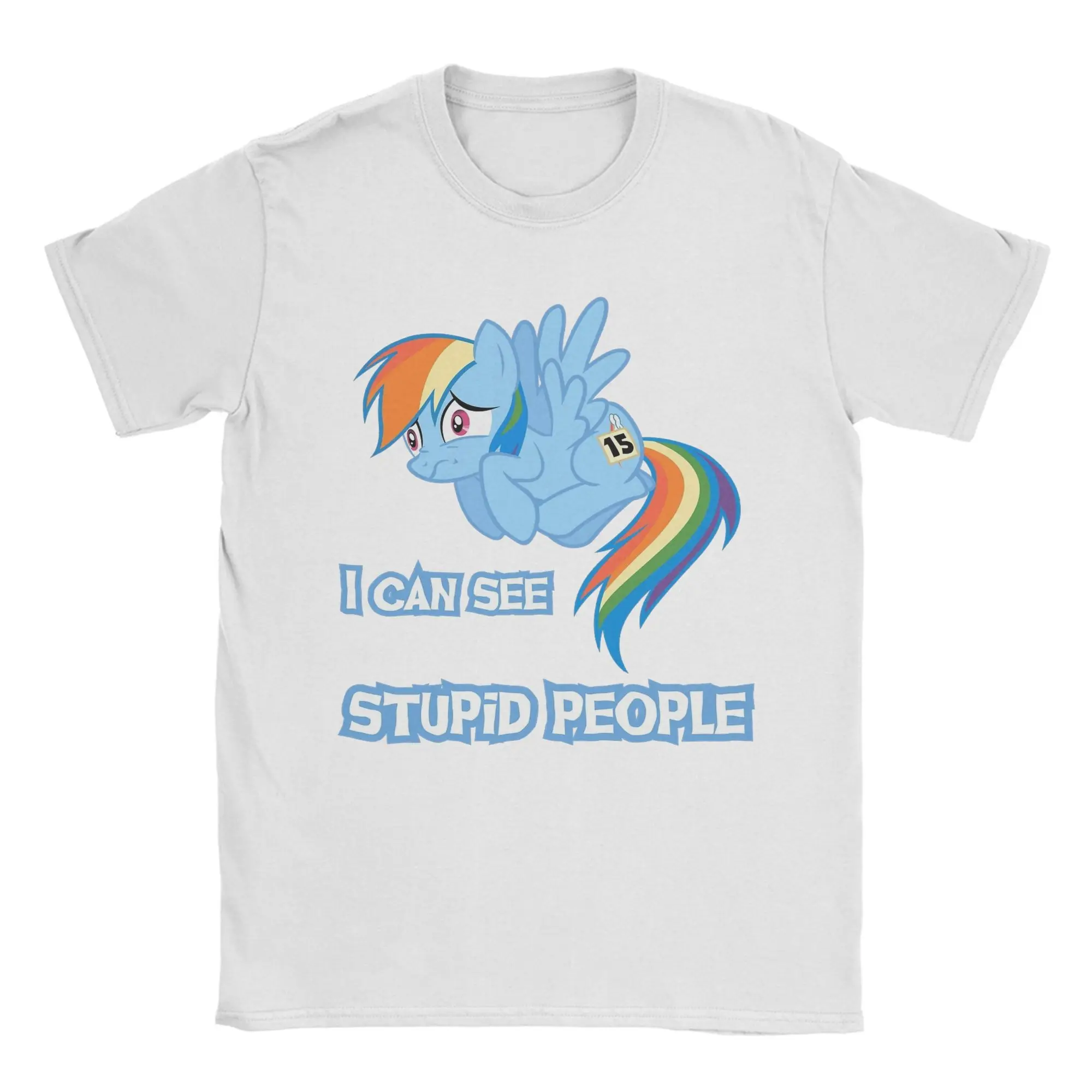 Experience the fun and vibrant style of this this Rainbow Dash graphic T-shirt, perfect for casual wear in any season. Made from lightweight, breathable cotton, it offers ultimate comfort and versatility. The eye-catching design features a playful cartoon pegasus with a rainbow-colored mane and tail, expressing a cute yet slightly worried mood. The bold, light blue text “I CAN SEE STUPID PEOPLE” adds a humorous touch, making it a conversation starter. Its simple silhouette with a round neckline and short sleeves makes this shirt easy to style for everyday activities. Whether you're out with friends or relaxing, this T-shirt blends comfort with playful aesthetics, ensuring you'll look great and feel cool all day long.