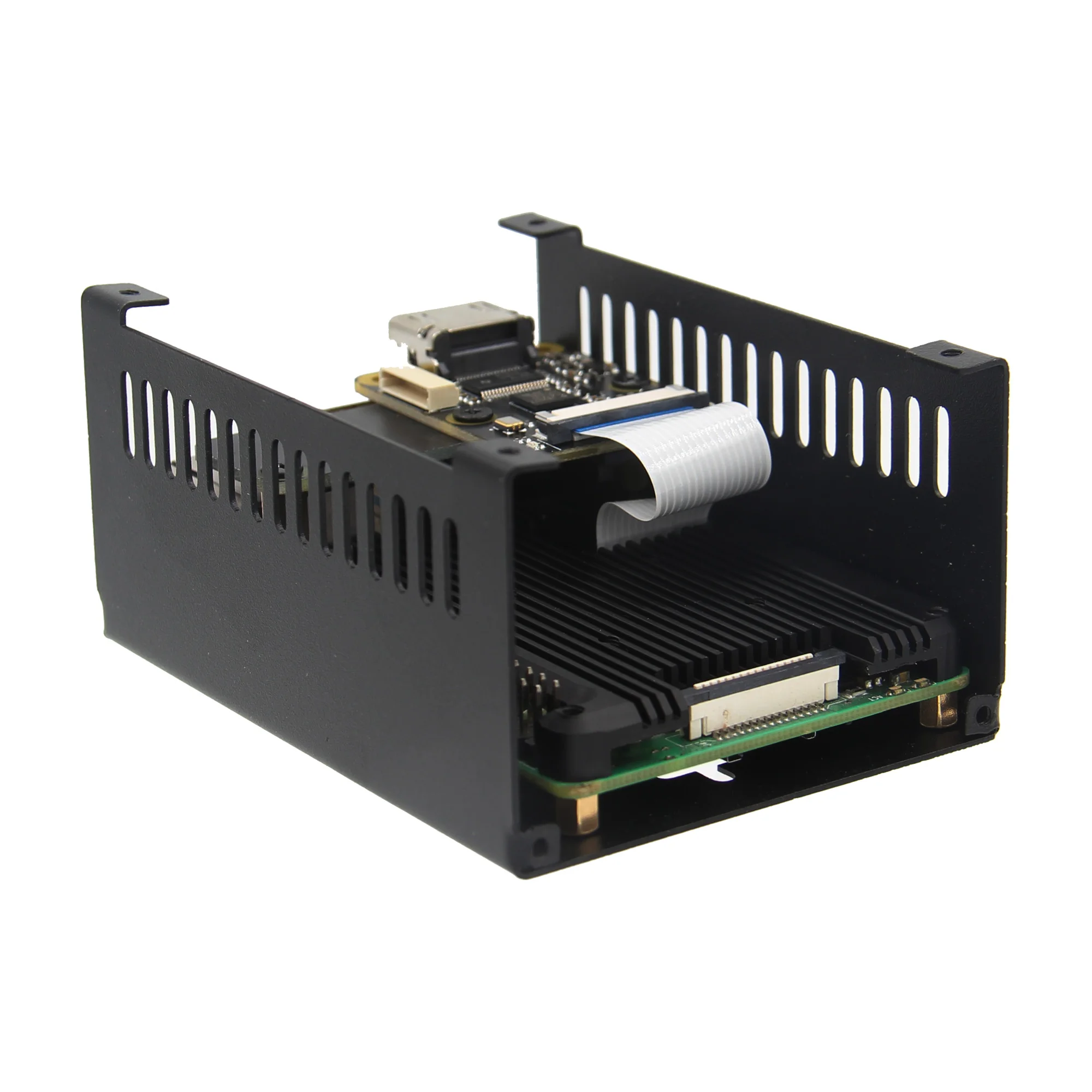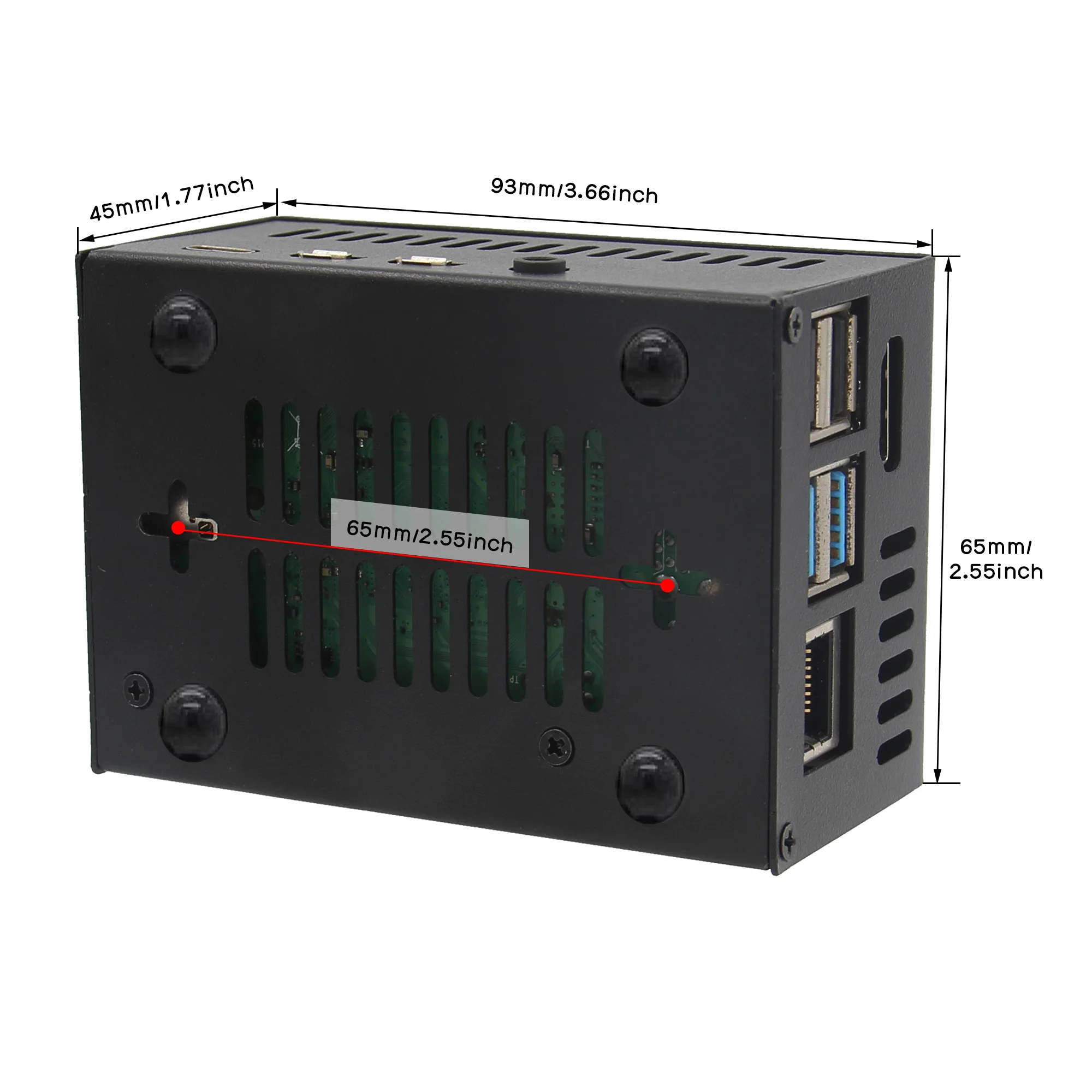 The Geekworm X630-C1 metal case combines durability and sleek design, measuring 121×90.5x45mm (4.76×3.56×1.77″), and is crafted from sturdy black metal. It features a circular vent grille with a 4010 2-pin 5V cooling fan, alongside three aluminum heatsinks for optimal heat dissipation. The case offers a reserved TF card slot for effortless access, four rubber feet for stability, and VESA mounting holes spaced 65mm apart for versatile installation. Exclusively compatible with the X630 HDMI to CSI-2 Module for Raspberry Pi 4 Model B, it maintains a minimalist, industrial aesthetic perfect for professional or enthusiast setups.