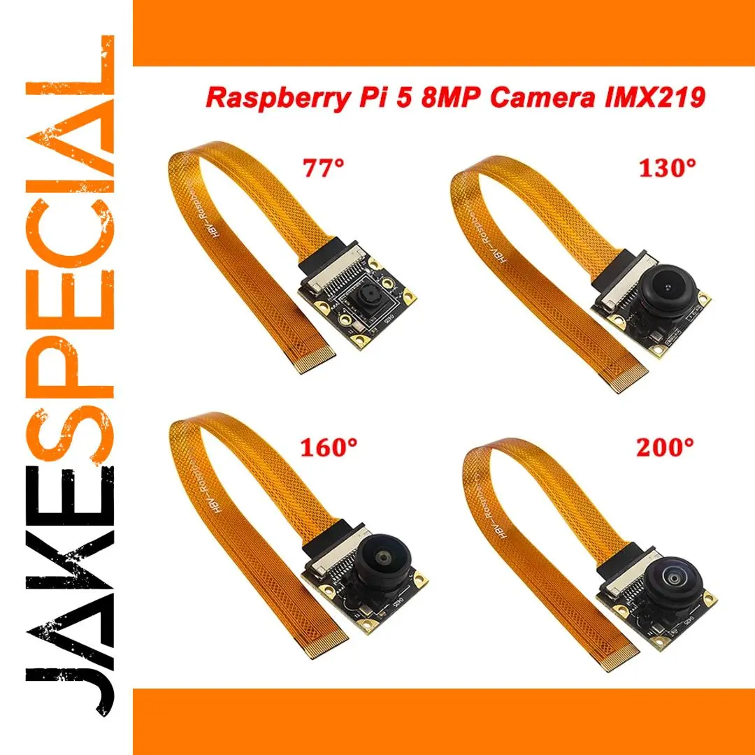 Experience the high-quality imaging capabilities of this set of camera modules, designed specifically for Raspberry Pi 5. Each module features an 8MP IMX219 sensor chip, ensuring crisp, clear images and videos. The modules come with various lenses offering different viewing angles: 77°, 130°, 160°, 160° with two lights, and 200°, allowing you to select the perfect perspective for your project—whether close-up, panoramic, or wide-angle. The sleek, rectangular black circuit boards are paired with flexible orange ribbon cables, making installation easy and flexible. The modules' minimalist design combines modern aesthetics with high functionality, making them ideal for surveillance, time-lapse, or creative multimedia projects. These modules provide a reliable, versatile imaging solution for tech enthusiasts and professional creators alike.