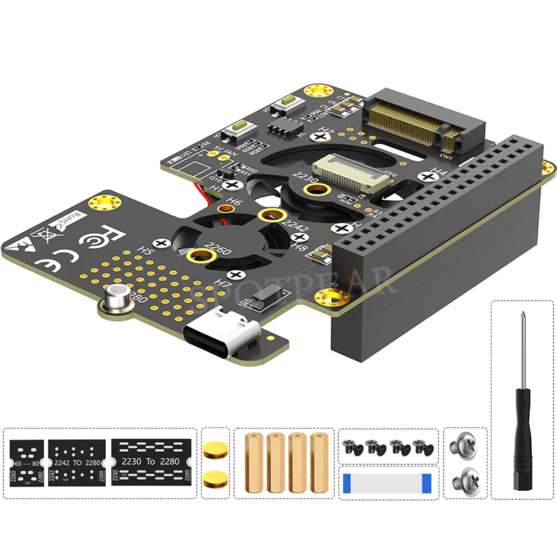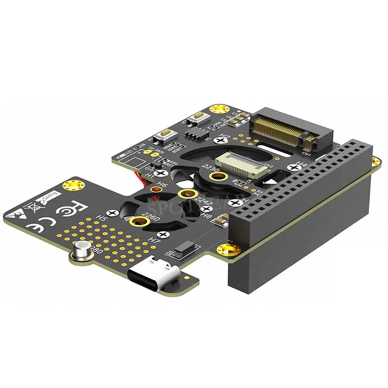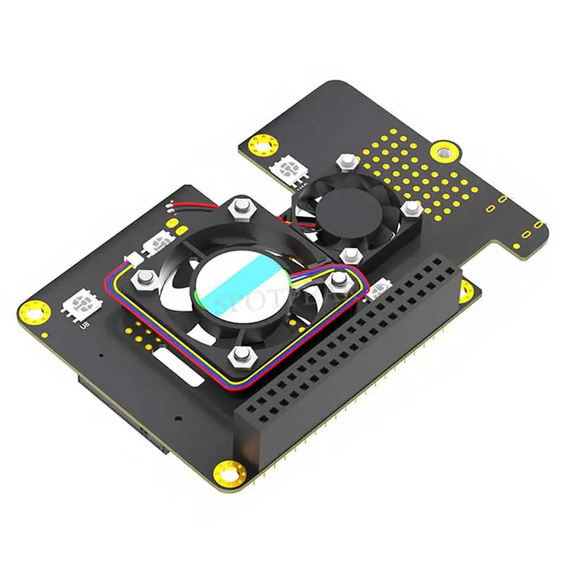 Immerse yourself in a high-quality experience with this sleek Raspberry Pi 5 PCIe to M.2 NVMe SSD Hat. Crafted for optimal performance, it combines a minimalist black design with functional enhancements, making it perfect for tech enthusiasts seeking reliable expansion. The top extension board features precise yellow mounting holes that add a subtle pop of color against its matte surface, complemented by surface-mount components, resistors, and capacitors for a sophisticated look. Dual active cooling fans ensure efficient heat dissipation, with a protective shroud and neatly routed wiring emphasizing its organized design. The smaller cooling fan on the bottom board maintains style with its black frame while its multicolored wires add a touch of vibrancy. This device transforms your Raspberry Pi 5 into a high-performance machine with a clean, modern aesthetic.