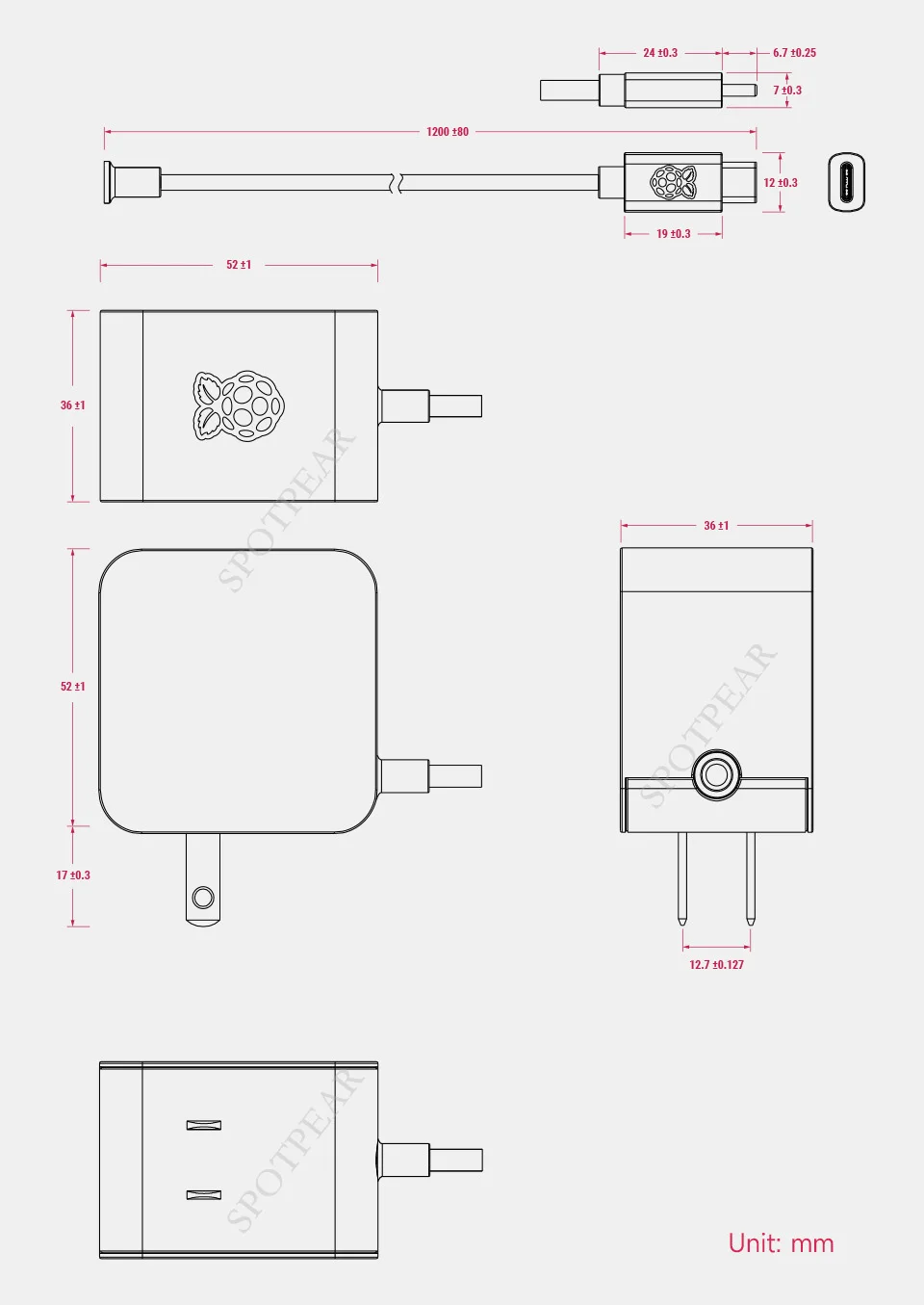 Experience reliable, high-performance charging with this compact, matte black power supply designed specifically for Raspberry Pi 5. Its minimalistic, cube-shaped design with embossed Raspberry Pi logo adds a touch of sophistication to your setup. The device’s smooth exterior and modern aesthetic make it unobtrusive yet stylish, blending seamlessly into any workspace. Equipped with a 1.2-meter USB Type-C cable and multiple plug options (US, UK, EU), it offers versatility and convenience. This power supply ensures stable voltage delivery, supporting USB Power Delivery standards with adjustable outputs of 5.1V/5A, 9V/3A, 12V/2.25A, and 15V/1.8A, up to a total of 27W. It’s an essential tool for powering peripherals, overclocking, and maximizing your Raspberry Pi 5’s capabilities.