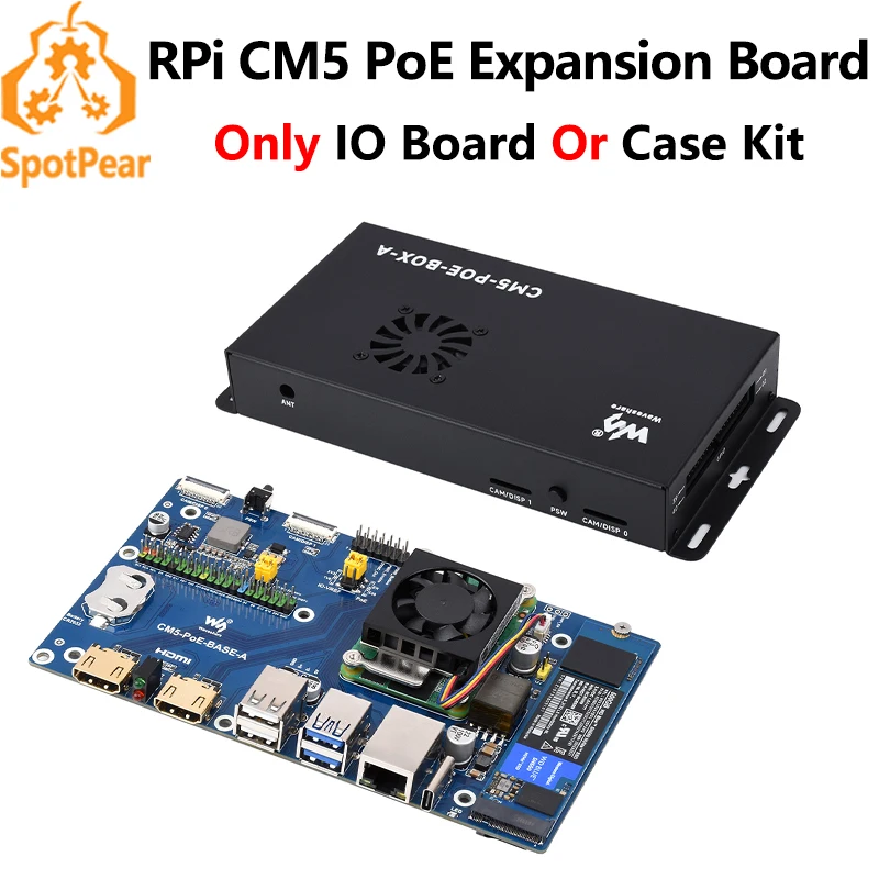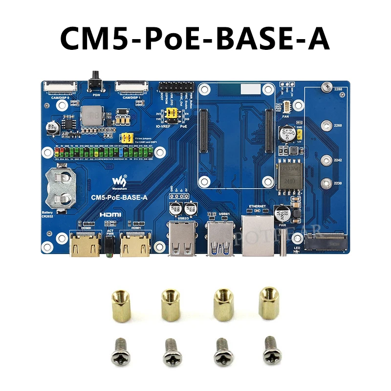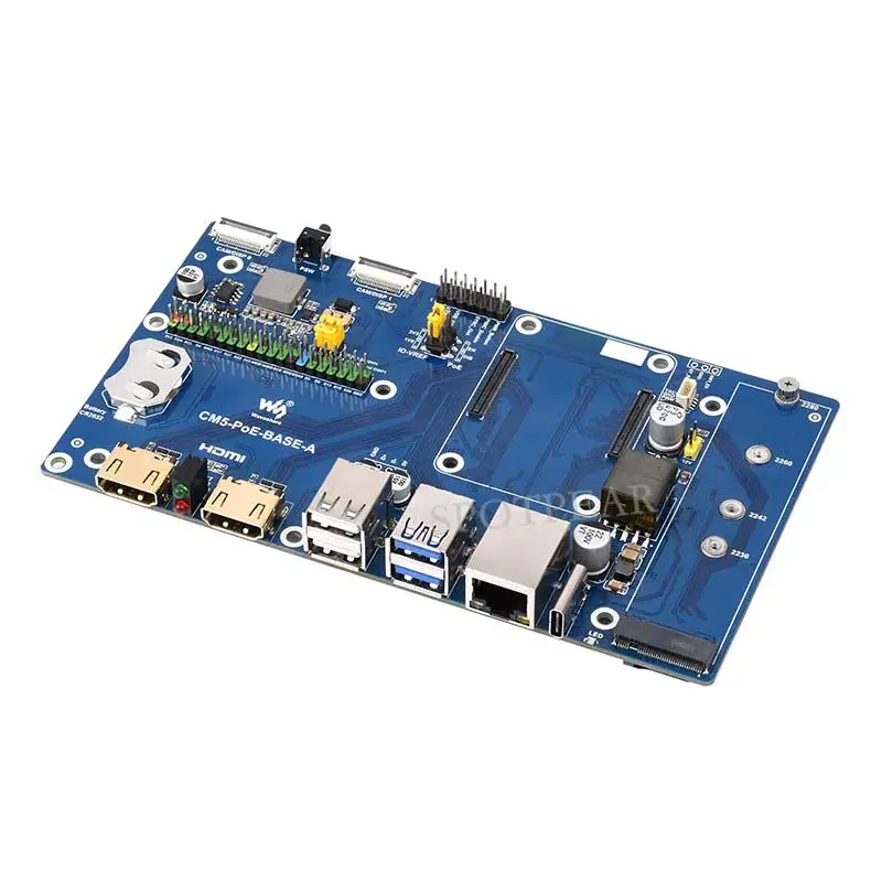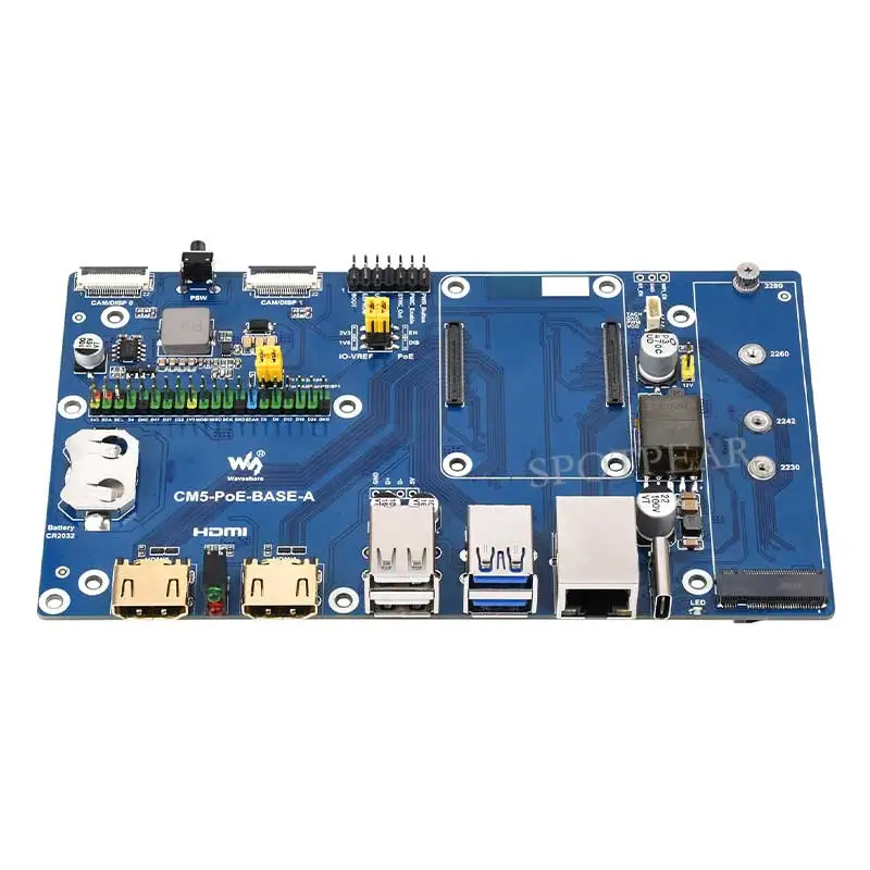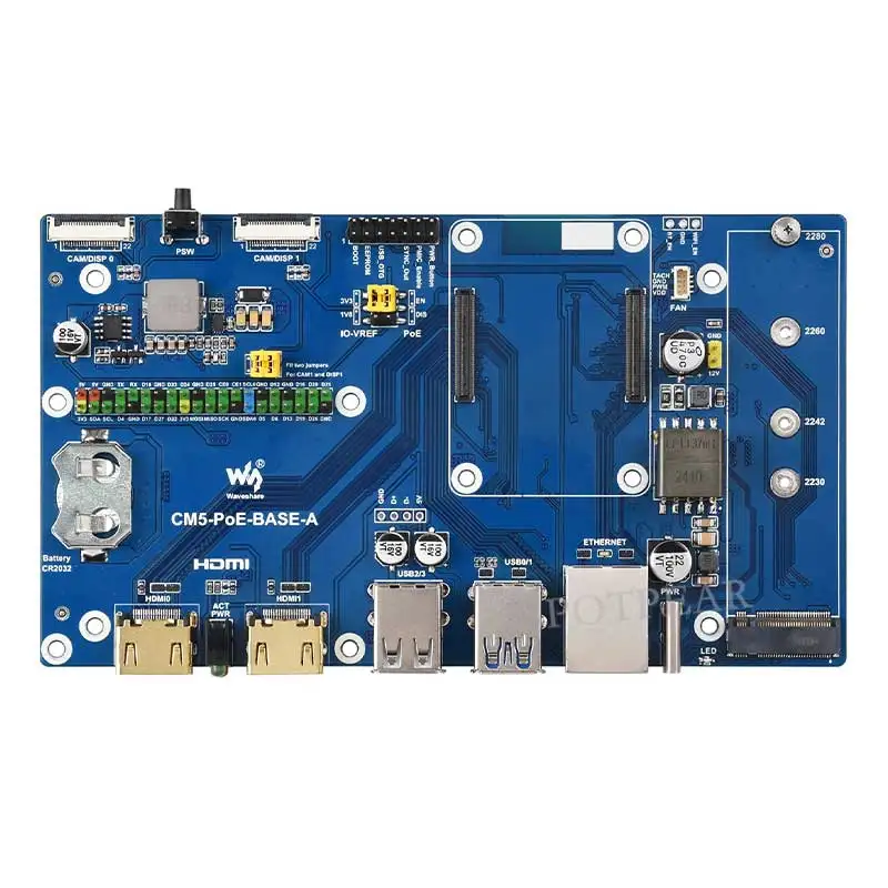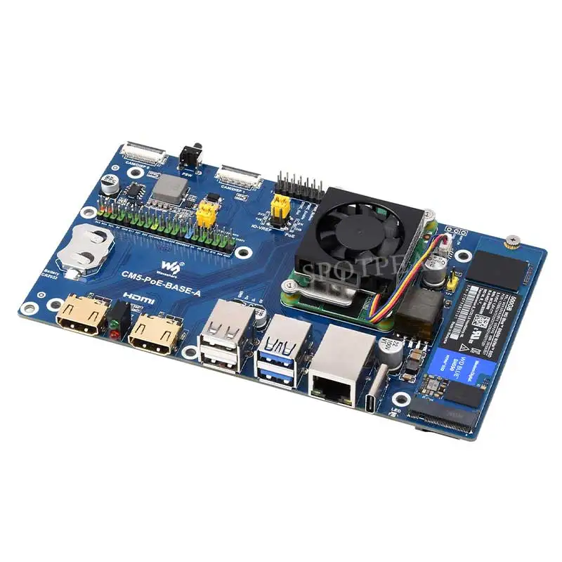 Experience seamless connectivity and high-performance computing with this this Raspberry Pi Compute Module 5 PoE BASE A IO Board. Designed for versatile applications, this compact blue board features a standard CM5 socket and a 40-pin GPIO header compatible with all Compute Module 5 variants. Its striking gold-colored ports provide durable and reliable connections for Ethernet, USB, HDMI, MIPI, and TF cards, all meticulously labeled and aligned for ease of use. The integrated cooling fan and airflow vent ensure efficient heat dissipation, maintaining optimal performance during intensive use. Perfectly suited for network-intensive and industrial projects, this board offers a clean, professional look while providing powerful functionality. Imagine upgrading your device with this cutting-edge board that combines style with technical prowess.