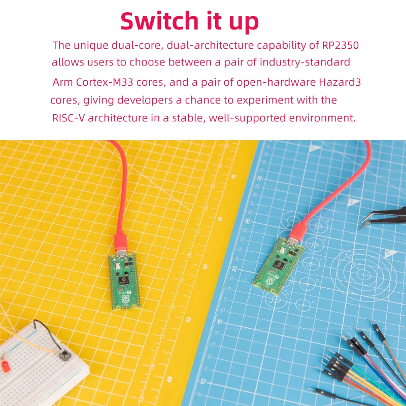 - Offers dual processors: Arm Cortex-M33 or Hazard3 RISC-V cores at 150MHz for flexible task management.