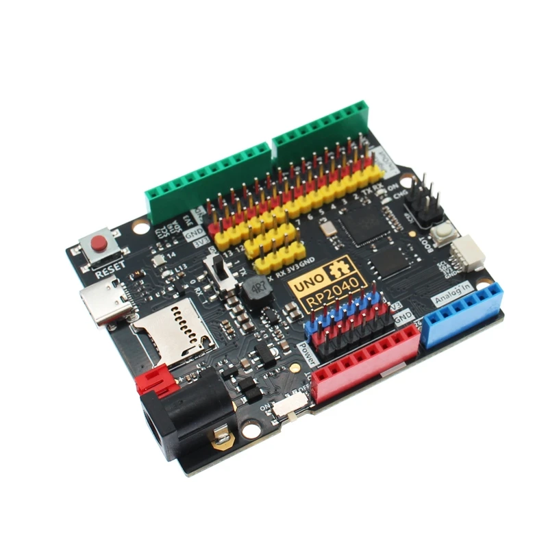 Elevate your development projects with this custom DIP package development board featuring a Raspberry Pi RP2040 microcontroller equipped with 16MB of flash memory. Designed for programming, learning, and experimentation, this compact and sleek rectangular board offers a vibrant green pin header for easy connectivity. It includes a red RESET button, multiple power and I/O headers, a black microSD slot, and an audio jack, all arranged thoughtfully for seamless use. The board’s modern aesthetic combines bold red accents with subtle metallic components, making it a trustworthy choice for enthusiasts seeking reliable performance and precise design in a versatile platform compatible with the Raspberry Pi UNO ecosystem.