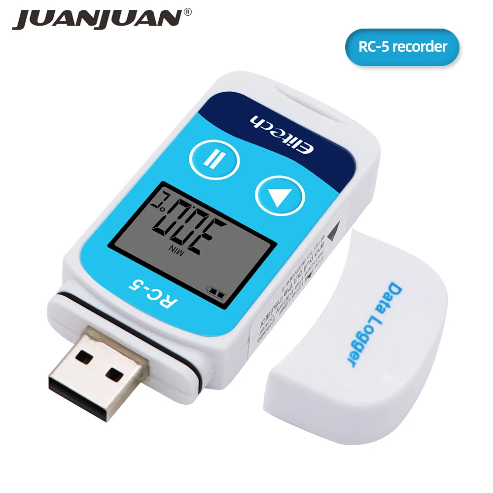 The RC-5+ USB Data Logger from JUANJUAN is an advanced digital thermometer designed for precise temperature monitoring in various environments, featuring a measurement range of -30°C to 70°C with an accuracy of ±0.5°C (within -30°C to 40°C) and ±1°C for other ranges. With a recording capacity of 32,000 readings and adjustable intervals from 10 seconds to 24 hours, it uses a built-in NTC thermistor and outputs data via USB for direct computer connection. Its compact dimensions of 80 x 25 x 12 mm and IP67 rating for dust and water protection make it ideal for labs, cold storage, and logistics.