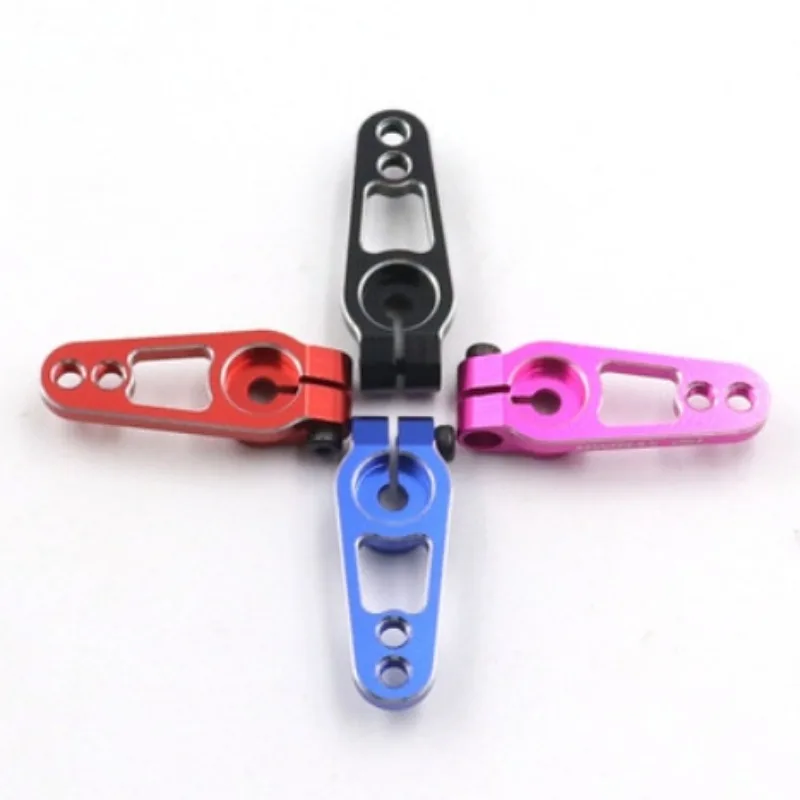 - Set includes four vibrant-colored aluminum servo arms — pink, red, blue, and black, offering both style and durability for your RC vehicle upgrades.