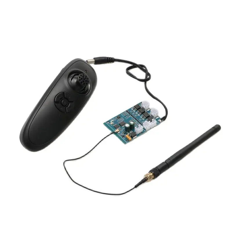 Experience reliable remote control for your RC bait boat with this sleek, black remote control kit. Designed for durability and simplicity, it boasts a modern ergonomic handle that fits comfortably in your hand. The control buttons are intuitively arranged, with a prominent joystick for precise steering, complemented by small function buttons for LED control, cruise mode, and bait silo operations. Its minimalist surface emphasizes ease of use, while the sturdy antenna ensures a stable 500-meter control range. The receiver board, compact and utilitarian with a clean white finish, hosts multiple electronic components, connectors, and a built-in gyroscope for automatic straight-line travel. This kit enhances your DIY projects, making control intuitive and long-distance reliable, thanks to durable design and high-quality components.