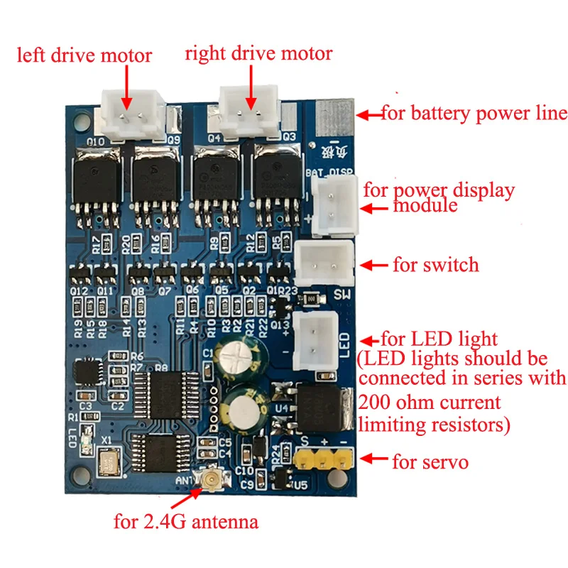 - Includes interfaces for LEDs and servos, requiring a 200-ohm resistor for LED connections; designed for DIY boat customization, repair, and long-range remote control applications.