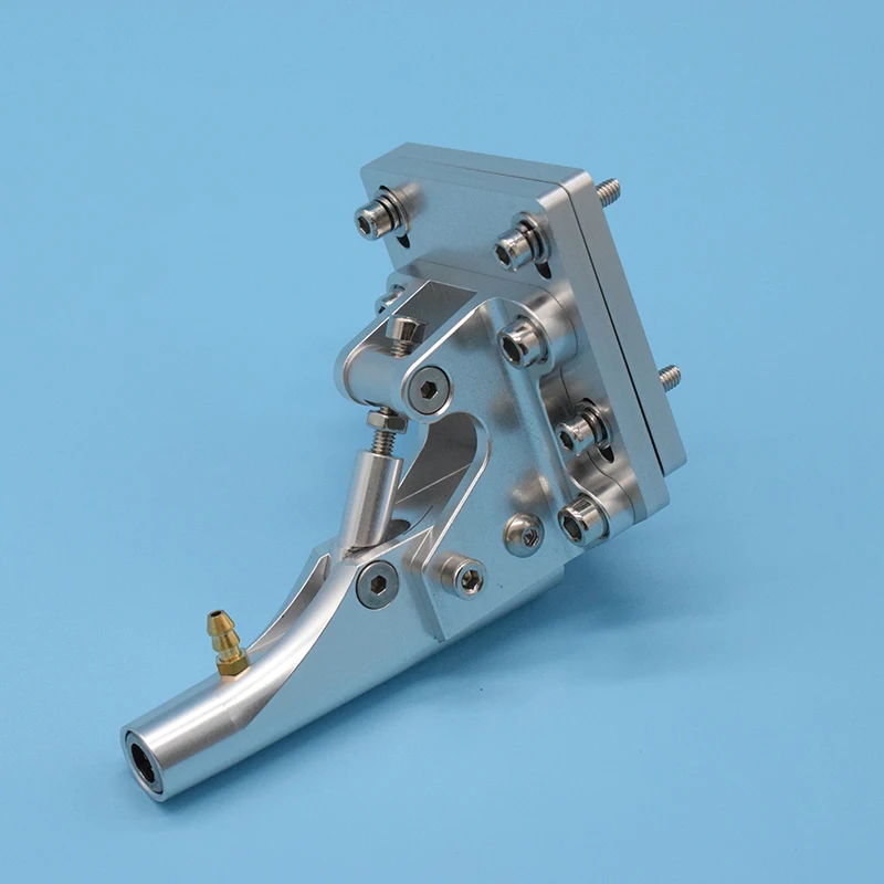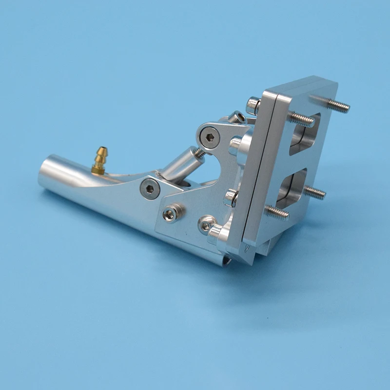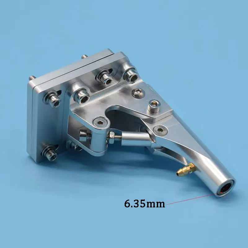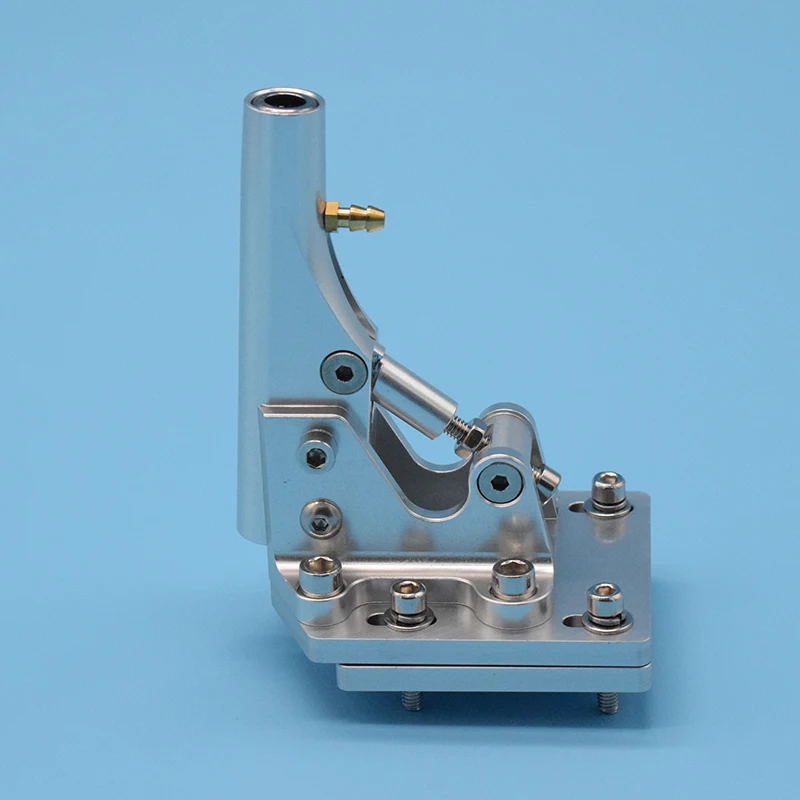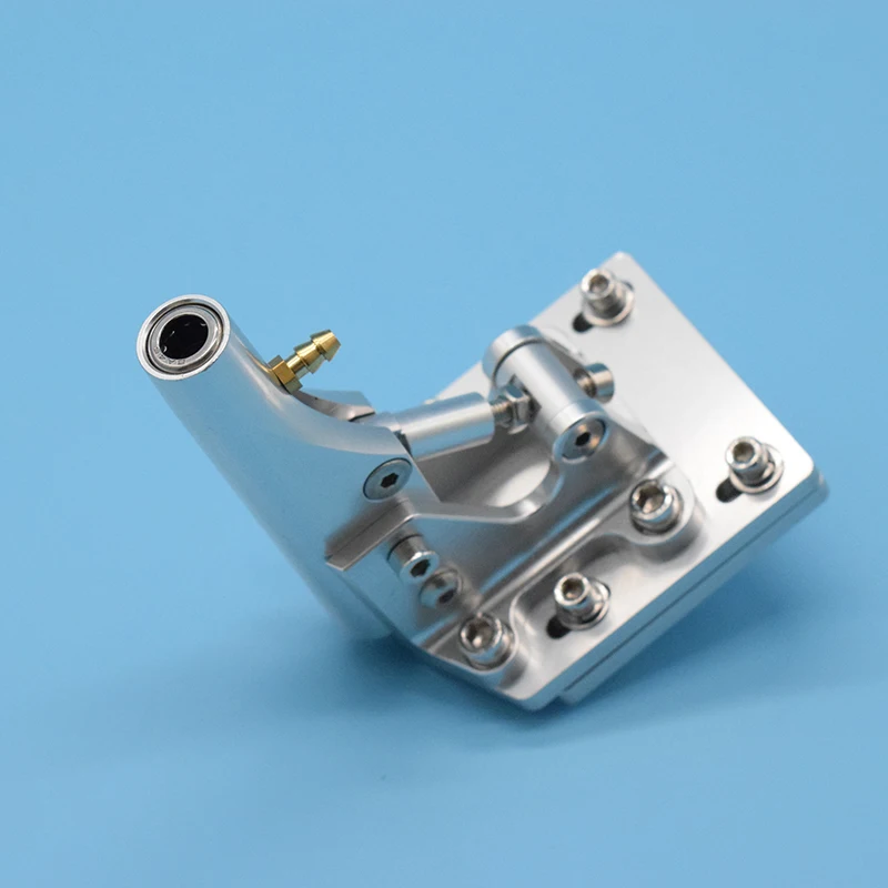 This high-quality metal flexible shaft strut with adjustable axle bracket is designed for gasoline and nitro RC racing boats, specifically compatible with Speed V models. It features a durable, shiny metallic finish with a 6.35mm (1/4 inch) diameter shaft, measuring 96mm in length, 55mm in width, and 73mm in height, offering precise performance and reliable durability. The minimalist, industrial design includes a flat mounting base with four screw holes and a curved tubular shaft extension, complemented by a gold-colored fitting for enhanced adjustability. No batteries or electrical components are required, making it an ideal upgrade for enthusiasts seeking stable and efficient propulsion in their RC marine projects.