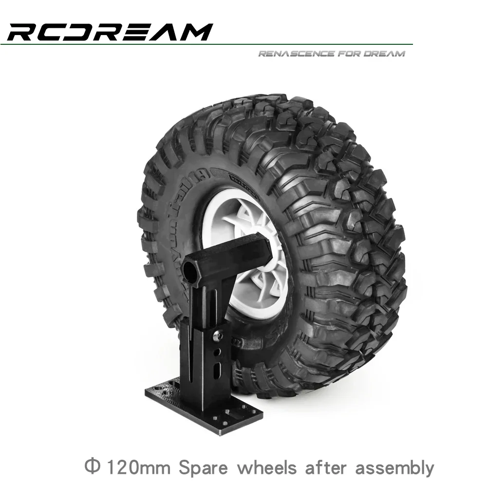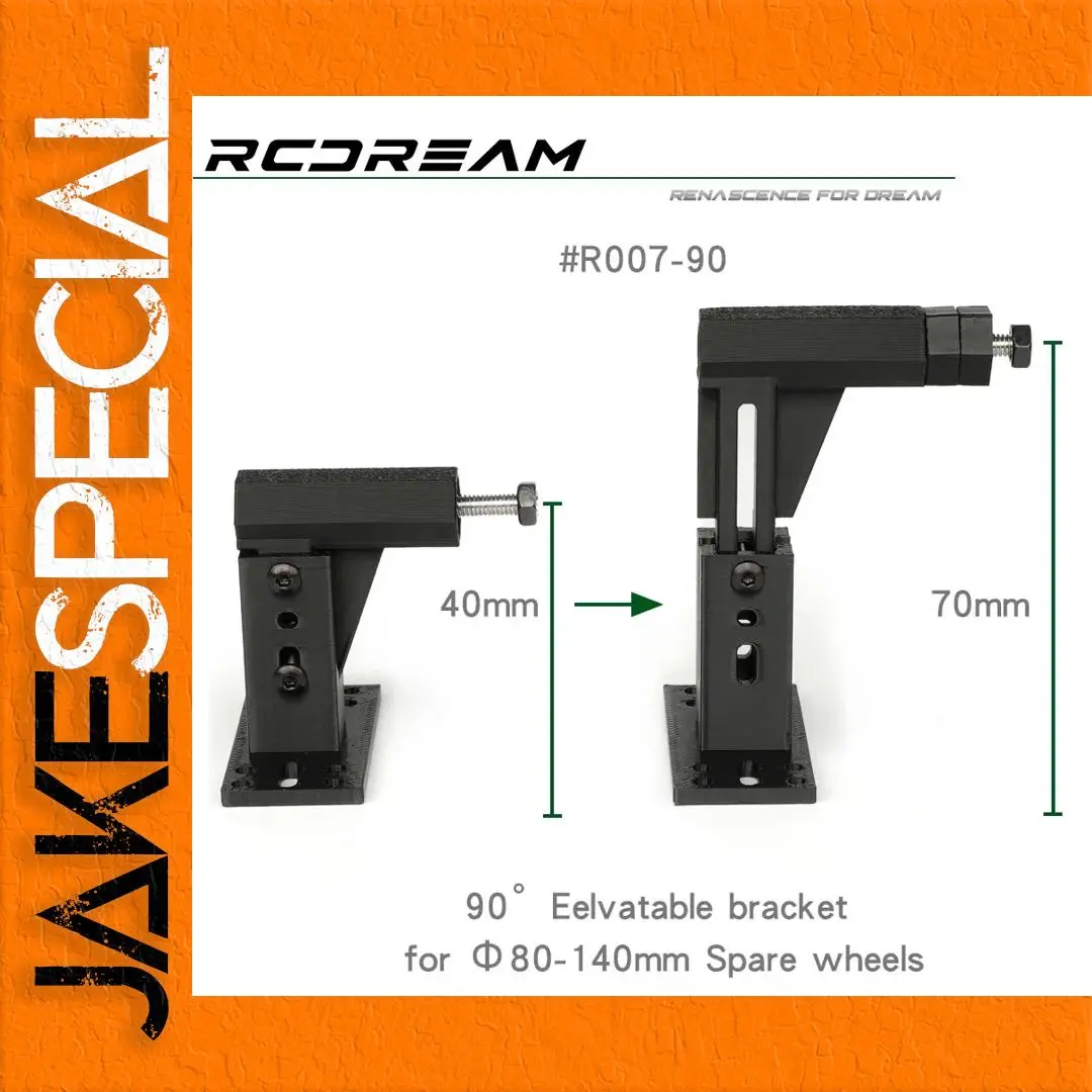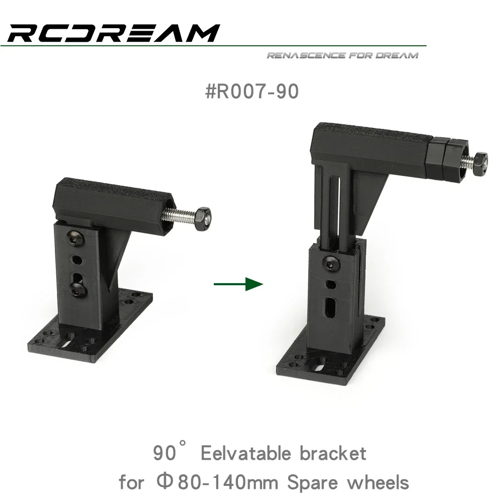 Enhance your RC vehicle with the RCDream 1/10 or 1/8 spare wheel bracket, crafted from durable 3D printed PLA in sleek black. Featuring a precise 90° vertical design, adjustable height, and compatibility with 80-140mm wheels and 12mm hex hubs, this robust and modular bracket offers straightforward installation with included screws and 3M tape for added stability. Its clean geometric lines and textured surface add an industrial aesthetic, perfect for customizing and upgrading your remote control car. Designed for RC models with a focus on practicality and adjustability, this bracket ensures a secure fit for your wheel setup, making your vehicle more reliable and ready for action.