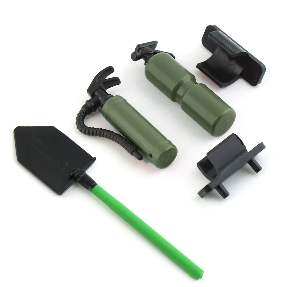 Enhance your 1/10 RC climbing cars with this detailed simulation fire extinguisher and military shovel set. Crafted from durable plastic, these accessories showcase authentic design with vibrant color options—red, blue, khaki, and army green—adding a rugged, tactical look to your vehicle. The fire extinguishers feature a realistic cylindrical shape, black handles, nozzles, and flexible black hoses, making them look and feel like real equipment. The military shovel boasts a green handle with a black, tapered blade, perfect for a rugged aesthetic. These accessories are assembled, lightweight, easy to mount, and designed to elevate your RC experience with a touch of realism and adventurous appeal, perfect for customizing or decorating your ride for outdoor or display purposes.